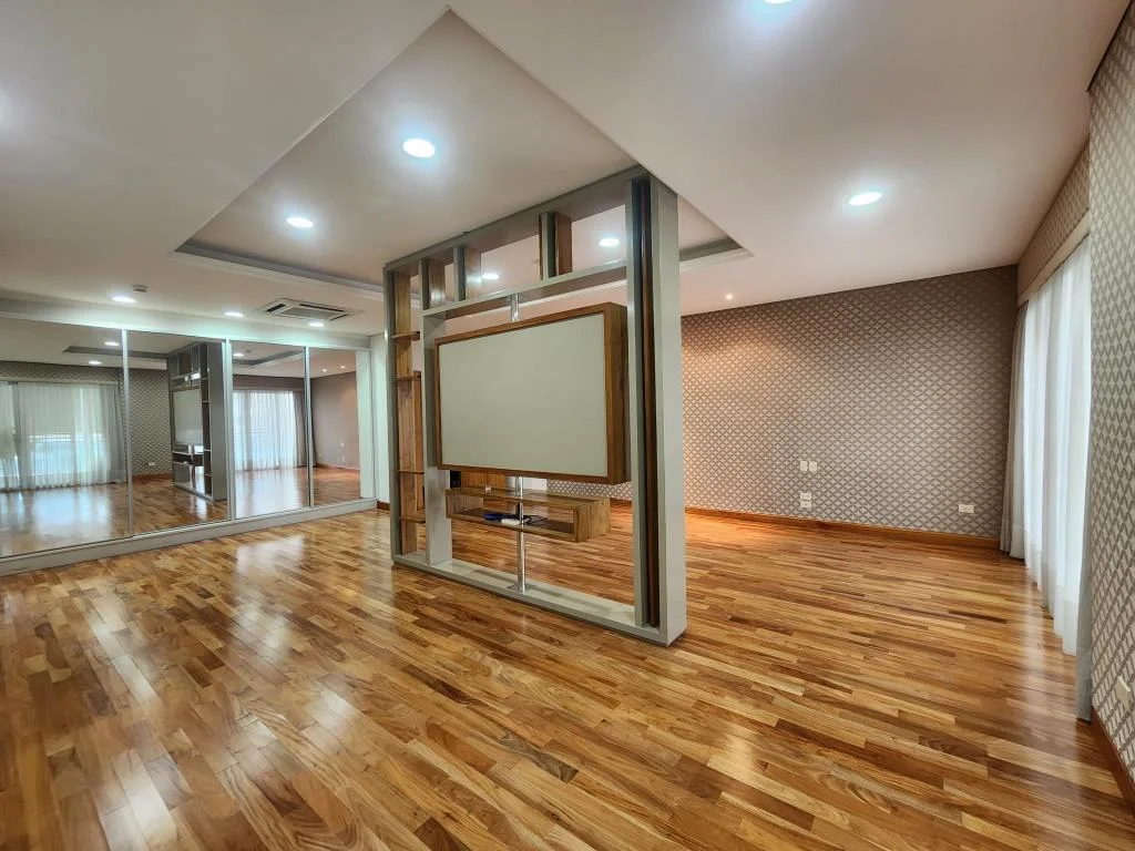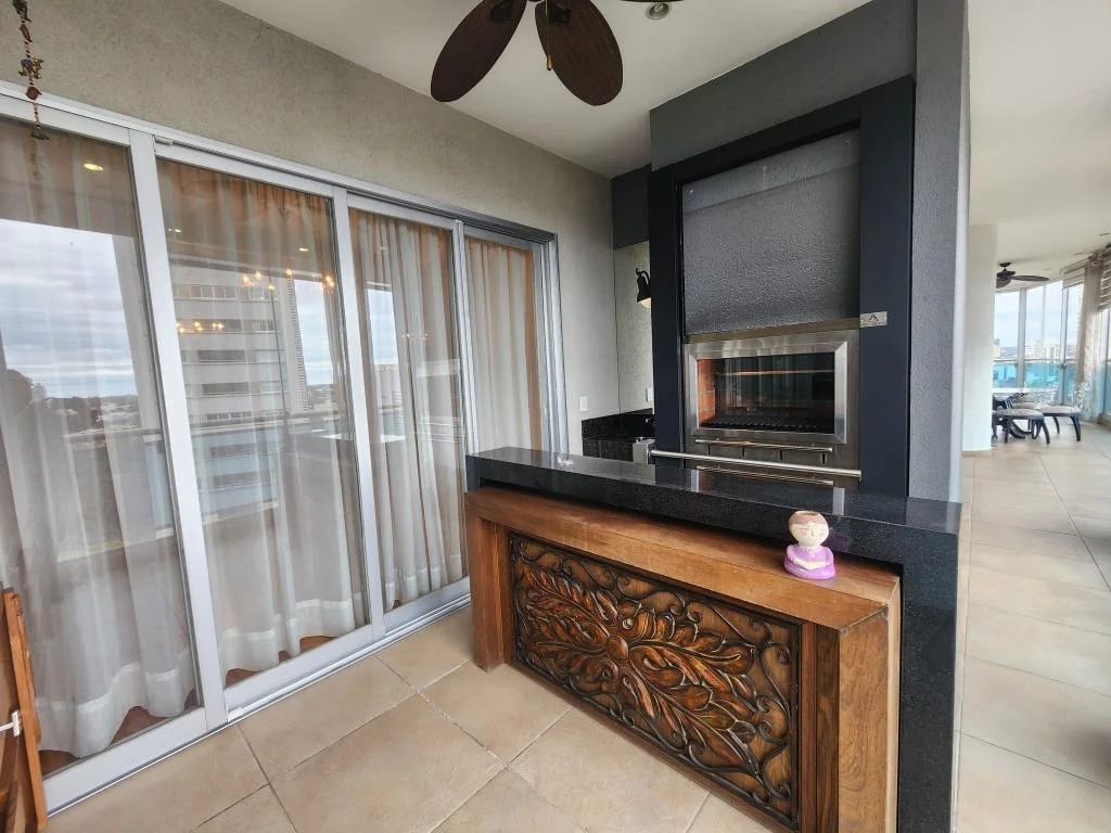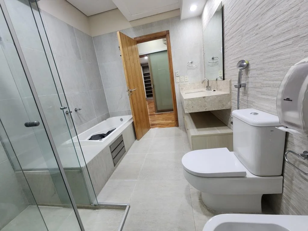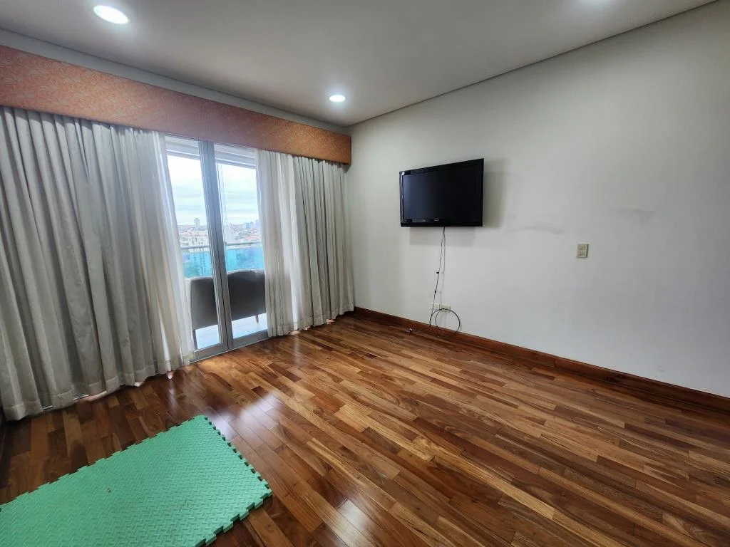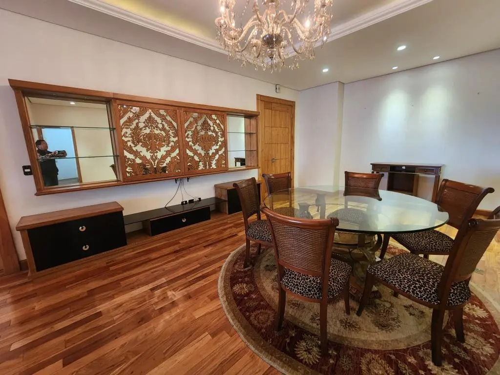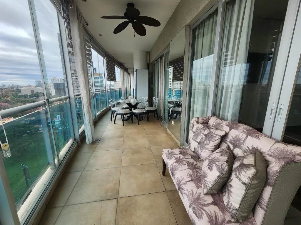 Estacionamiento 2, 2 entradas al Dpto. (Living Soc. y estar Com. diario), piso parquet, living Com. Soc., escritorio, baño Soc., balcón-terraza con parrilla, estar-Com. diario, 1 Dorm. master gigante (2 vestidores, 2 baños, sala de masaje), 2 Dorm. en suite (1 con vestidor), Coc. Amob., área de servicio (dormitorio, baño, lavadero equipado).