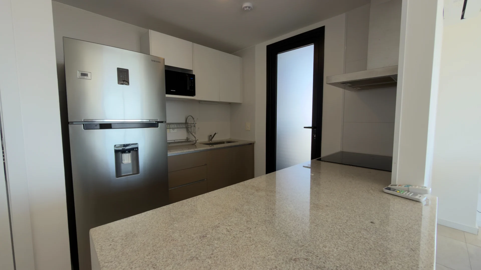 - Cocina amoblada y equipada con heladera, anafe, extractor, microondas cafetera.