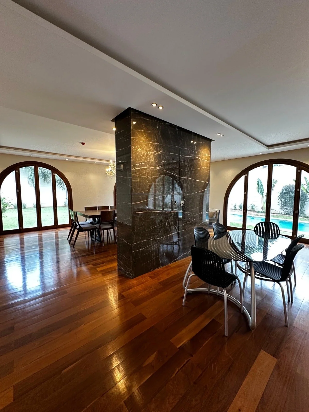 Planta Baja: • Hall de entrada• Baño social• Dormitorio en suite• Escritorio / Bar• Living• Comedor• Cocina separada con comedor diario• Quincho cerrado y climatizado con baño • Gimnasio• Deposito• Pileta de 16 metros de largo• Jardín amplio • Estacionamiento para 6 vehículos (4 techados)• Garita de seguridad