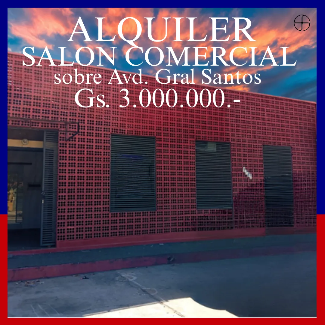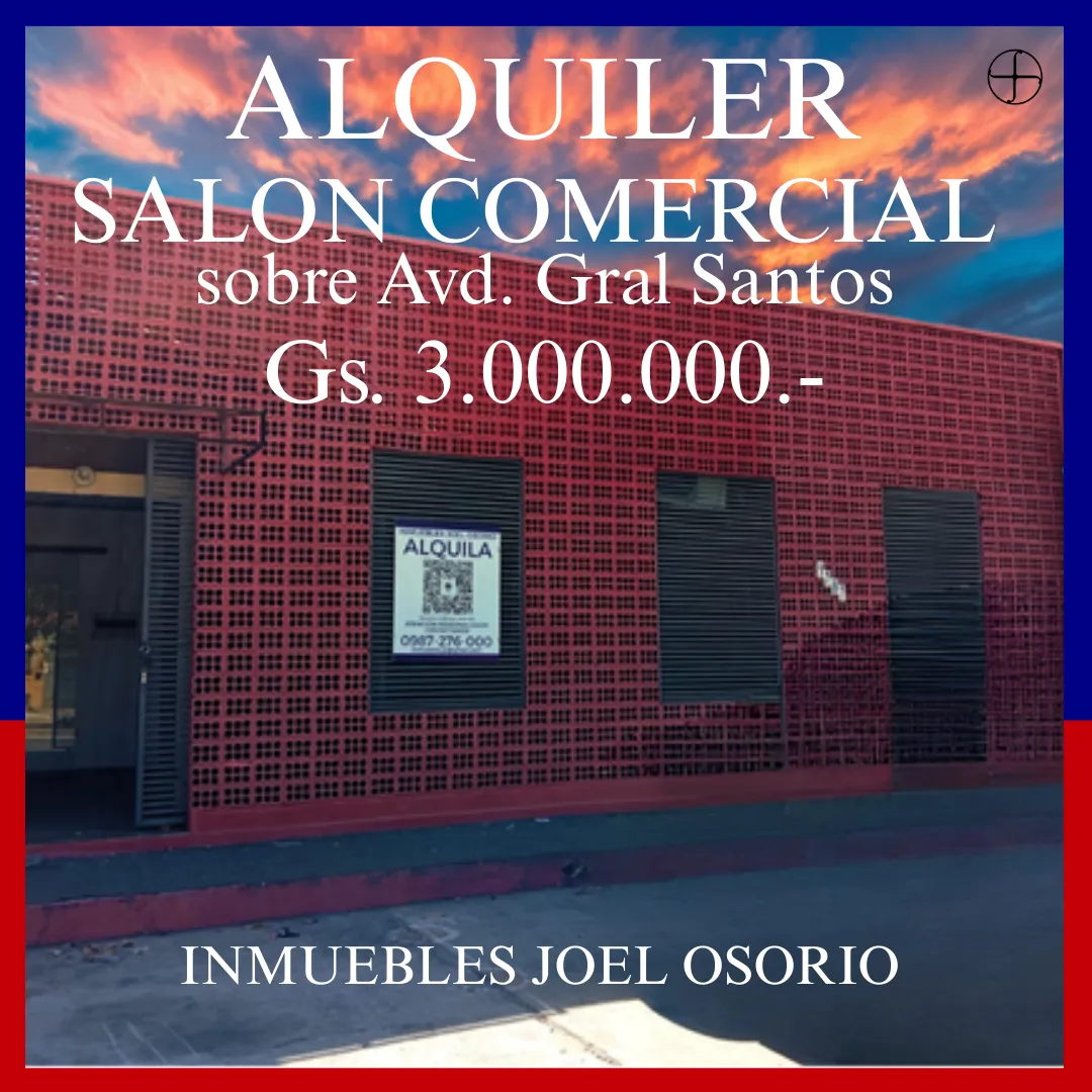 ALQUILO SALON COMERCIAL SOBRE AVENIDA GRAL SANTOS IDEAL PARA PELUQUERIAS, SOLARIUMS, TIENDA DE ROPAS ENTRE OTROS PRECIO: 3.000.000 UBICACION: https://maps.app.goo.gl/JYK89e6fNo79pidq5 INMUEBLES JOEL OSORIO