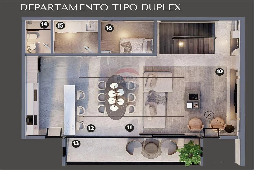 - El departamento tipo dúplex se divide en dos plantas diferentes, teniendo el sector social en la primera y el sector de descanso en la segunda planta.