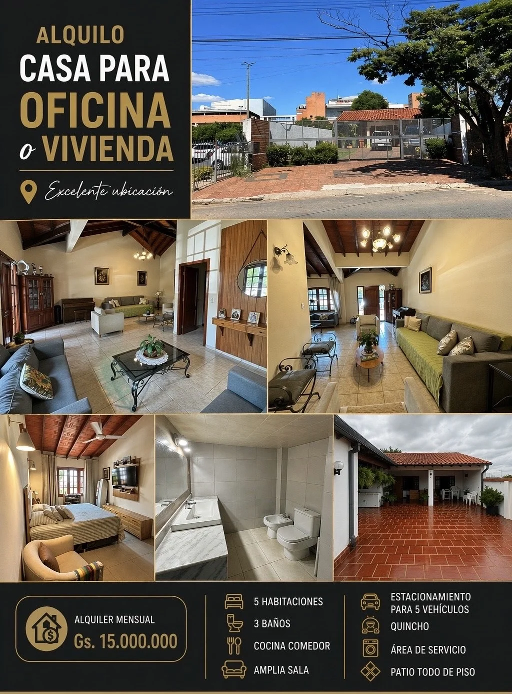 ✨ Características destacadas:• 5 habitaciones (oficinas privadas o dormitorios)• 3 baños• Cocina comedor• Amplia sala (recepción o living)• Área de servicio• Quincho (ideal para reuniones o espacio social)• Patio totalmente pavimentado• Estacionamiento para 5 vehículos ????
