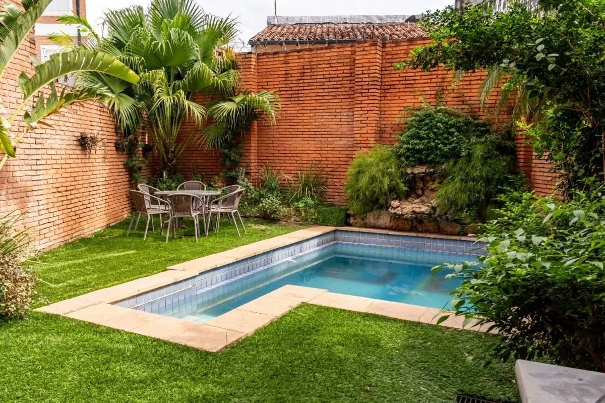 Patio, piscina con cascada.