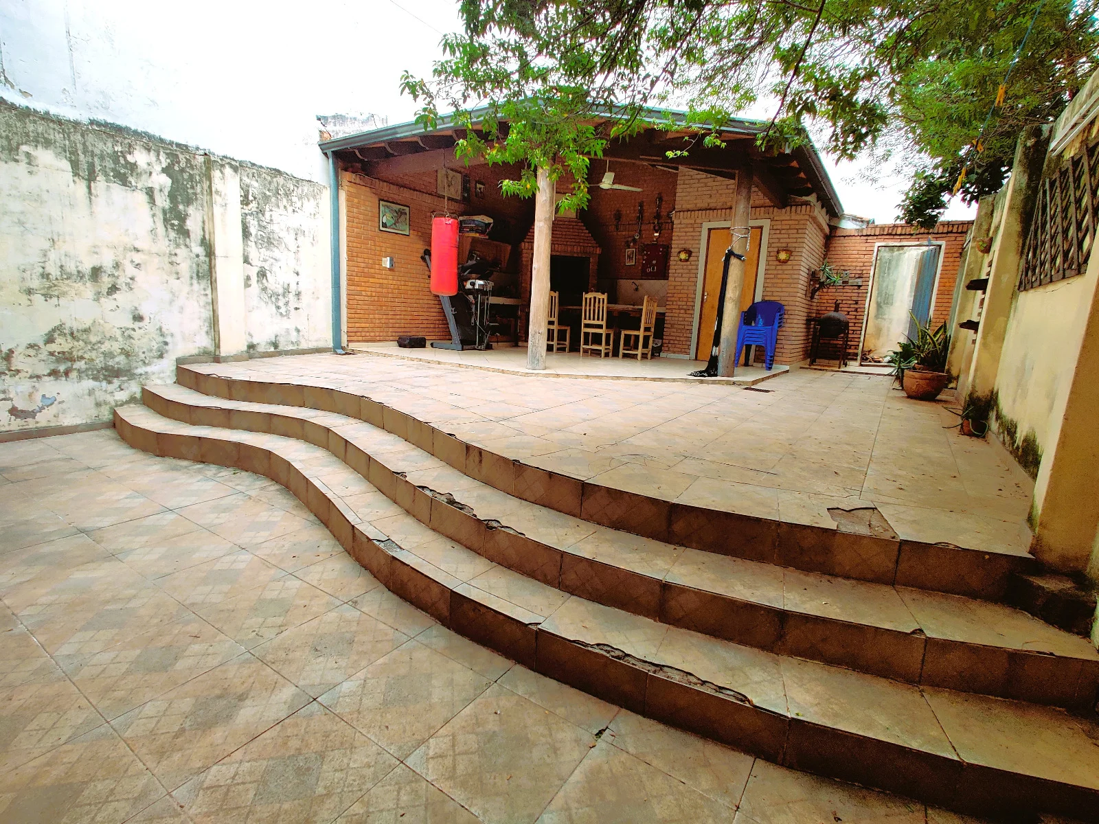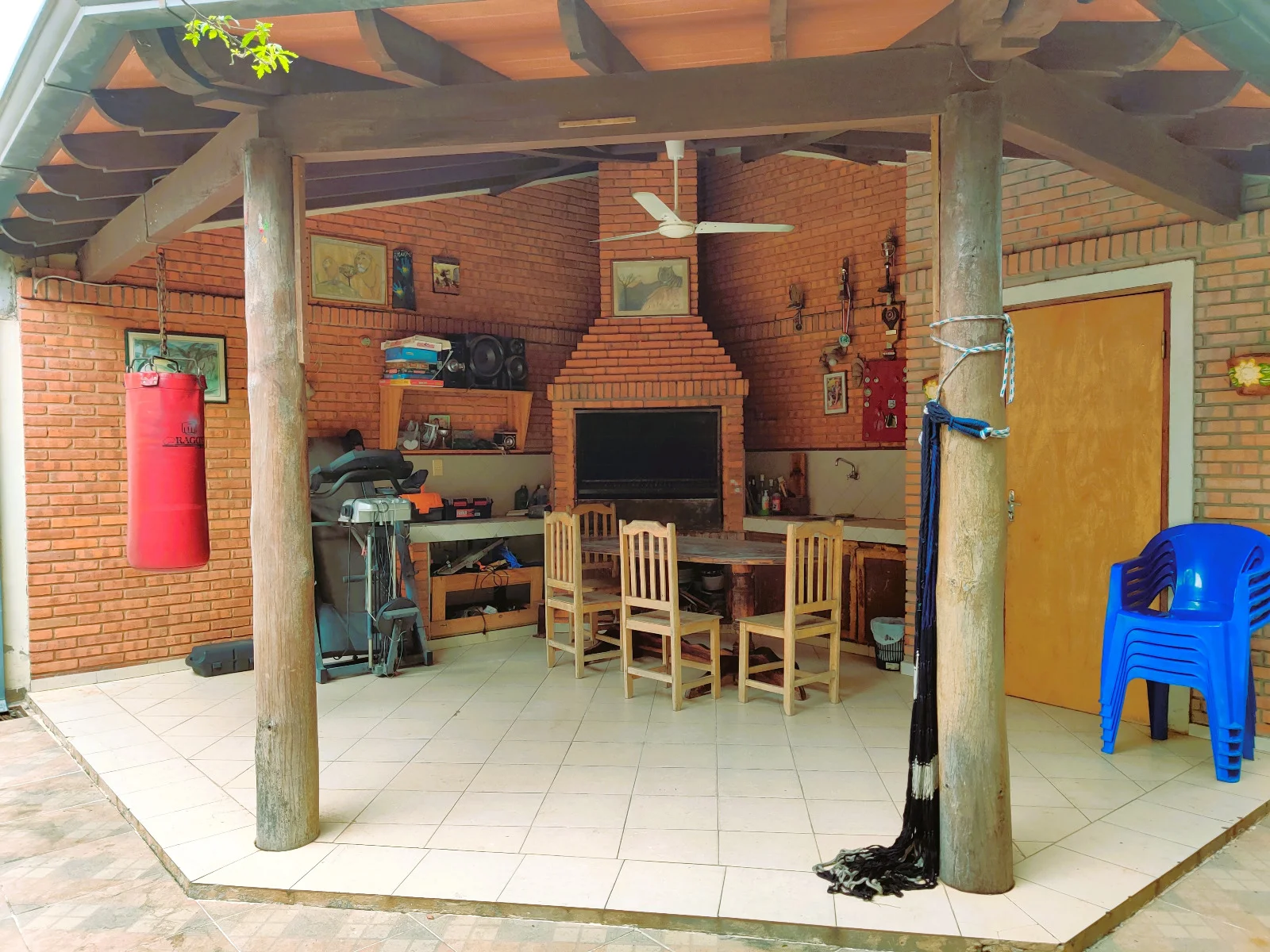 Patio con quincho con mesadas, parrilla de material y pilares de quebracho
