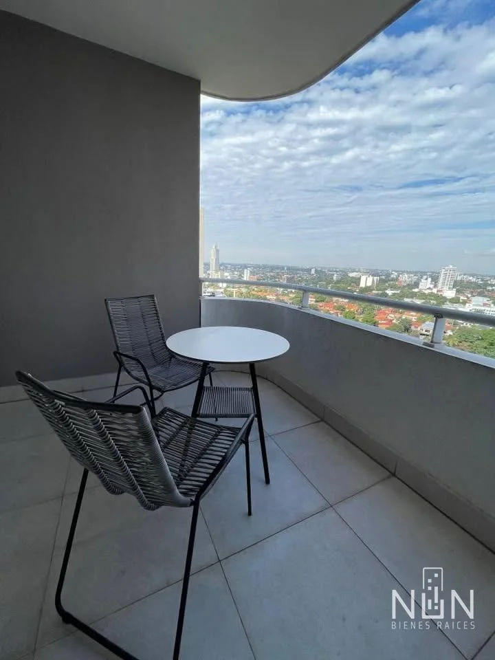 Alquilo departamento de 1 dormitorio full amoblado y equipado en el prestigioso Edificio Skytower, ubicado en pleno eje corporativo de Asunción. Este atractivo inmueble, situado en el séptimo piso, ofrece vistas únicas que combinan comodidad y estilo de vida moderno. La propiedad cuenta con un dormitorio, un baño y una sala-comedor-cocina integrados, ideal para disfrutar de un espacio funcional y acogedor. Además, dispone de un balcón y cochera cubierta, brindando una experiencia completa para el inquilino.
