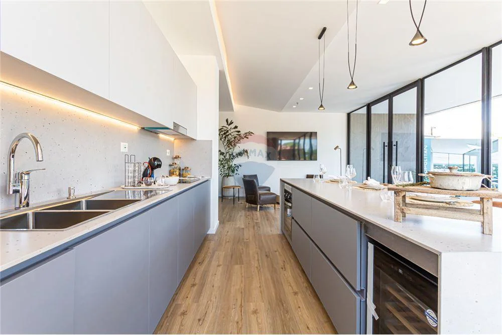 Amplia cocina semi integrada con desayunador, equipada con mesada de cosentino, anafe, purificador, horno, lavavajillas, heladera.