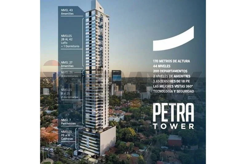 El edificio Petra Tower se encuentra ubicado en una zona de alta demanda de departamentos, por su cercanía al eje corporativo de Asunción. El departamento destaca por sus finas terminaciones. Este edificio es, además, el más alto del país.