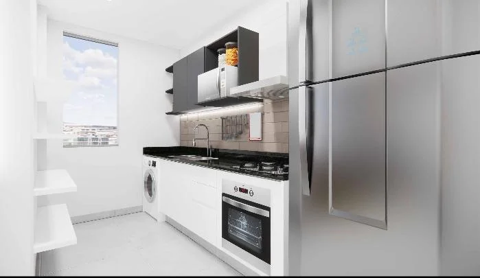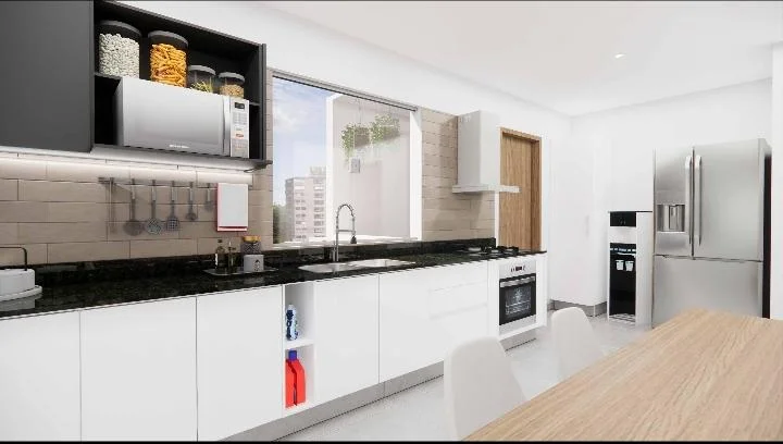 - Cocinas amobladas con horno, anafe, campana y muebles superiores e inferiores.