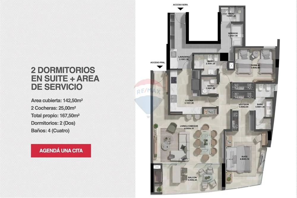 Con una inversión de 300.000 USD (incluyendo dos cocheras), esta unidad de 142,55 m² propios destaca por su distribución inteligente y detalles de confort superior. El departamento cuenta con un palier semi-privado que conduce a un amplio estar-comedor con cocina integrada y balcón, ideal para el esparcimiento social. La zona íntima está compuesta por dos dormitorios, ambos configurados en suite, brindando máxima independencia. Con áreas técnicas y de servicio completamente independientes, The Address ofrece la comodidad de una residencia de gran escala con la eficiencia de un edificio premium de última generación.