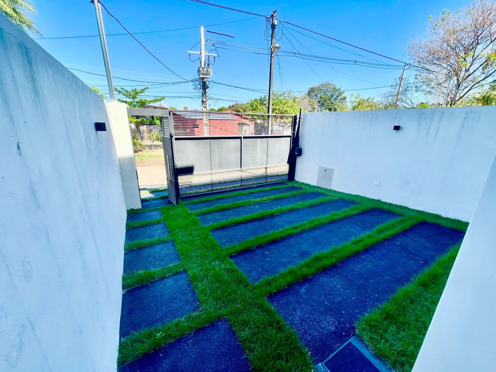 Portón eléctrico basculante, estacionamiento para dos vehículos.