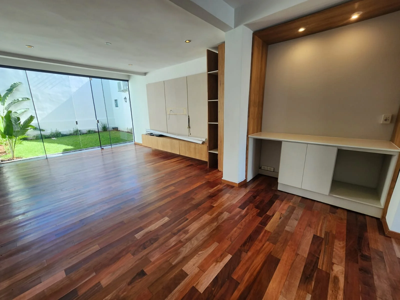 ▪️Recibidor y Living-comedor con pisos parquet, equipado con muebles empotrados tipo bar y panel para Tv.