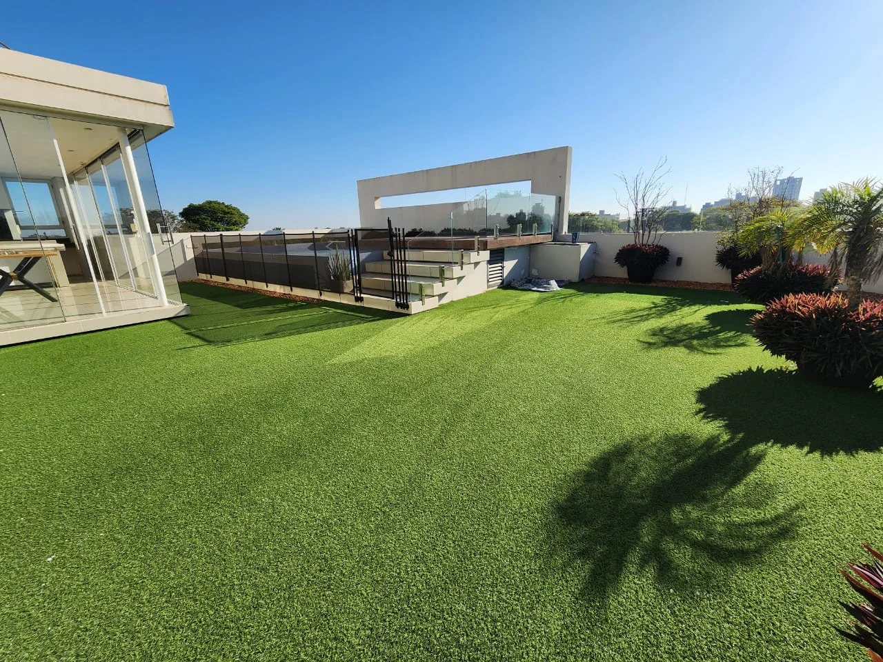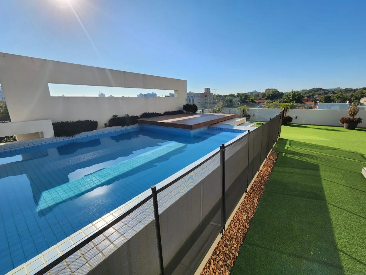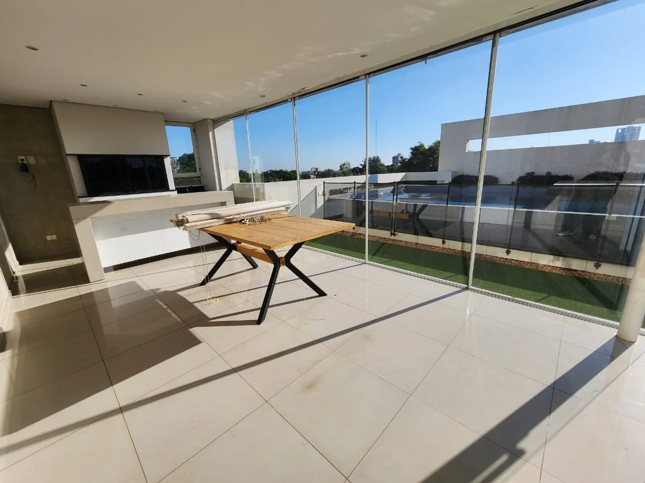 Amplia terraza propia con piscina borde infinito con quincho climatizado con parrilla.