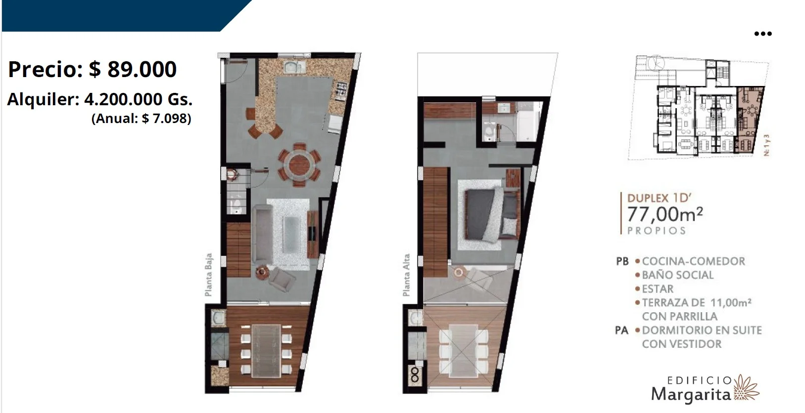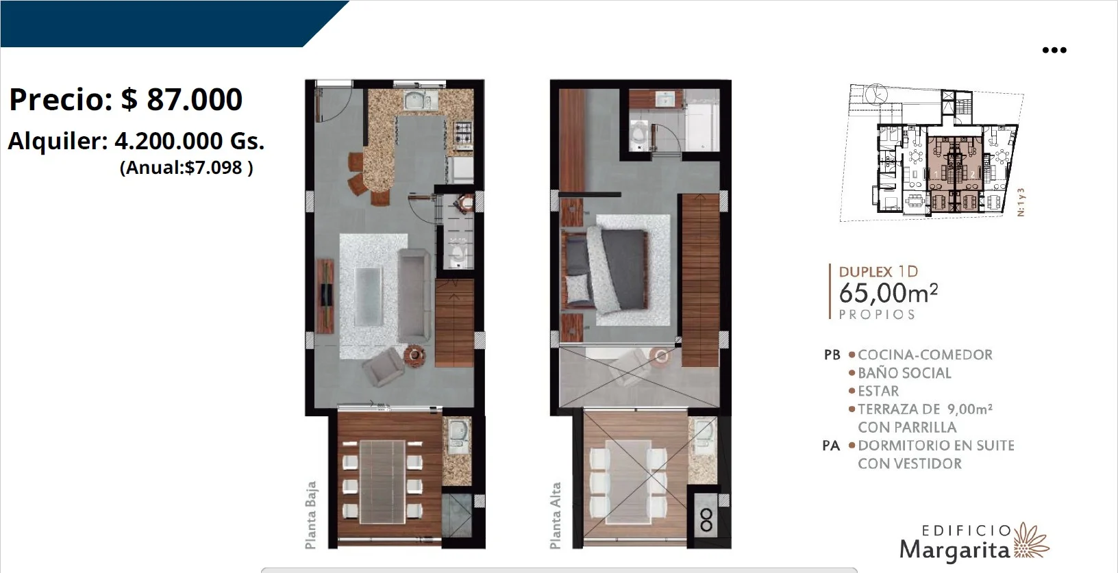 Gs. ~549,000,000 / + U$S 87,000 gastos comunes / U$S 1,338/m2