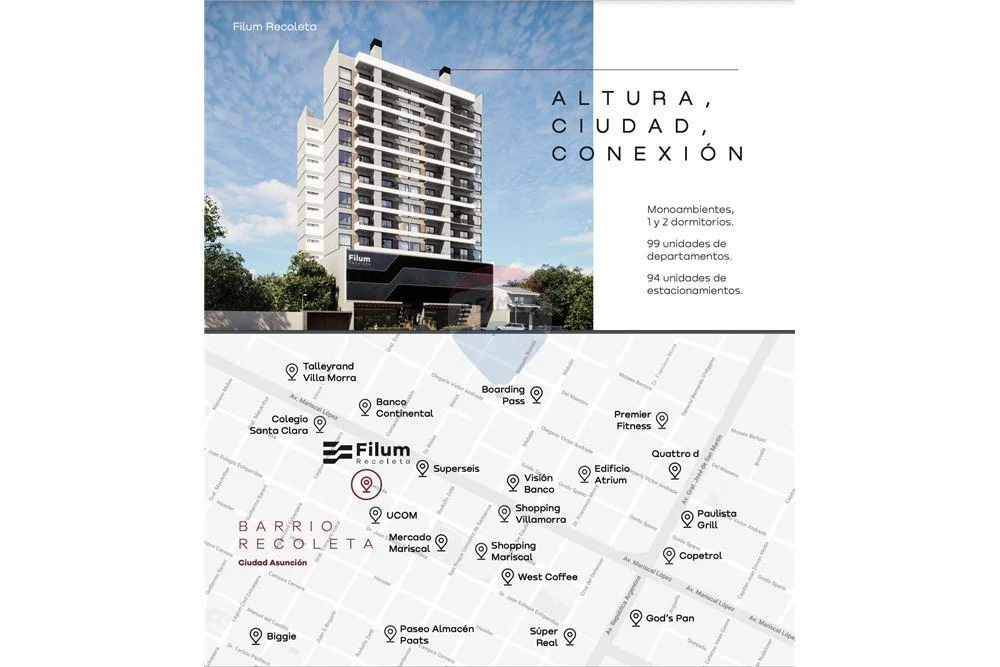 El Edificio FILUM Recoleta presenta un diseño distintivo con 11 departamentos por planta, ofreciendo una variedad de tipologías y un monoambiente ideal para inversión o vida urbana. La obra tiene como fecha final el 2026.