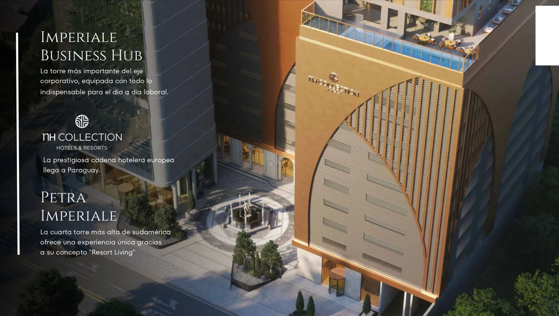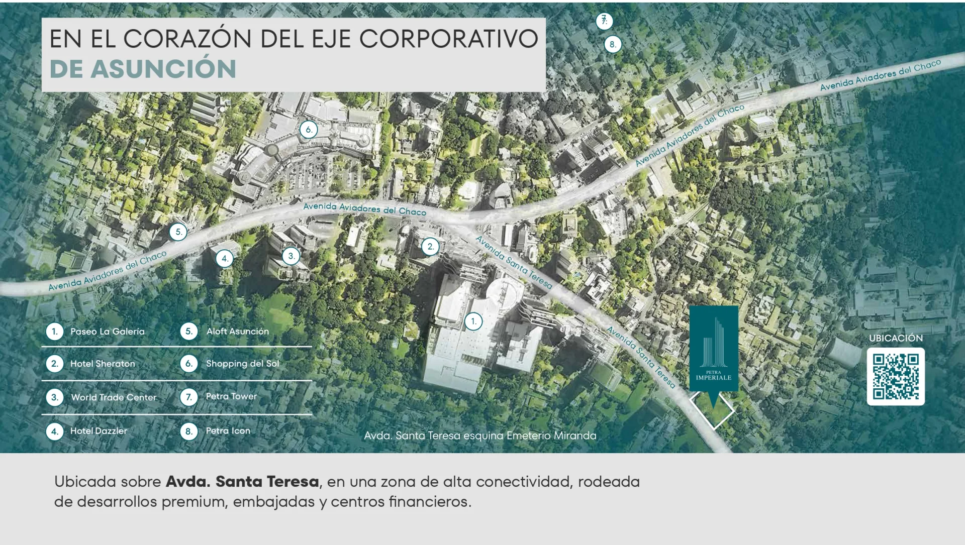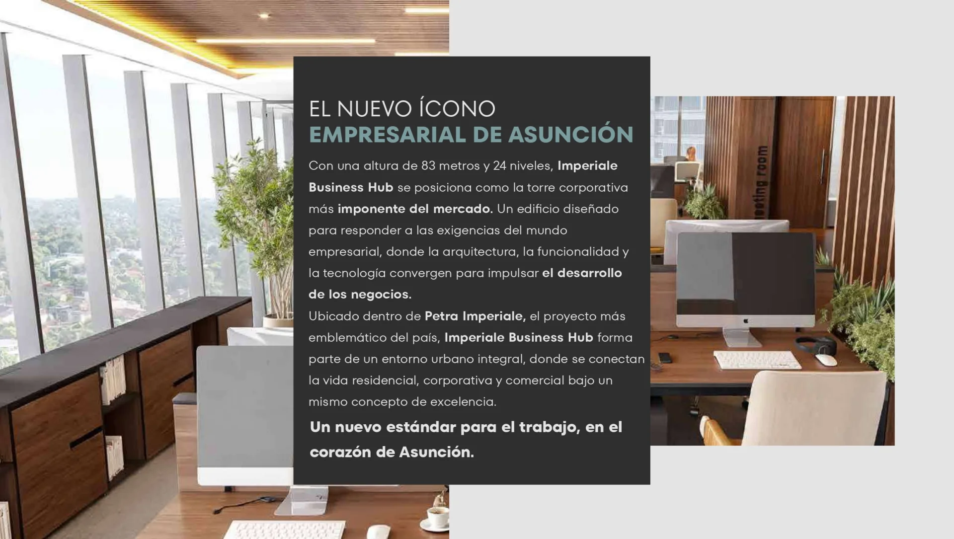Bienvenido a Imperiale Business Hub, el nuevo ícono empresarial de Asunción. Con 83 metros de altura y 24 niveles, esta imponente torre corporativa redefine los estándares del mercado, fusionando arquitectura de vanguardia, funcionalidad y tecnología para impulsar el éxito de su negocio. Ubicado dentro de Petra Imperiale, el proyecto más emblemático del país, forma parte de un entorno urbano integral que conecta la vida residencial, corporativa y comercial bajo un mismo concepto de excelencia en el corazón de Asunción. El edificio cuenta con 22 niveles de oficinas, lobby con control de acceso, ascensores de alta velocidad y un impresionante rooftop con restobar y centro de eventos. Además, ofrece servicios bancarios de Sudameris y un piso técnico en las oficinas para mayor flexibilidad. La Piazza, en la planta baja, es un espacio abierto cuidadosamente diseñado para inspirar conexión y bienestar, con áreas verdes, mobiliario urbano y una atractiva propuesta gastronómica. Imperiale Business Hub está estratégicamente ubicado en el corazón del eje corporativo de Asunción, sobre la Avda. Santa Teresa, rodeado de desarrollos premium, embajadas y centros financieros, asegurando alta conectividad y prestigio. Desarrollado por Petra Urbana y construido por el Consorcio AGB Tecinci, este proyecto es un testimonio de excelencia y calidad, posicionándose entre las 4 torres más altas de Sudamérica. Eleve su negocio a una nueva altura. ¡Descubra un nuevo estándar para el trabajo y eleve su negocio a una nueva altura!