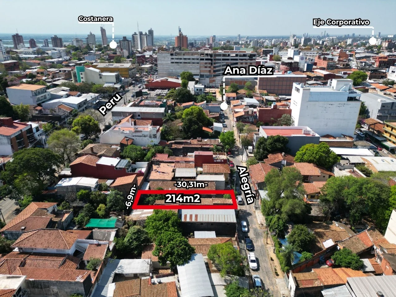 Medidas: 6,9 m de frente x 30,31 m de fondo = 214 m² totales.
