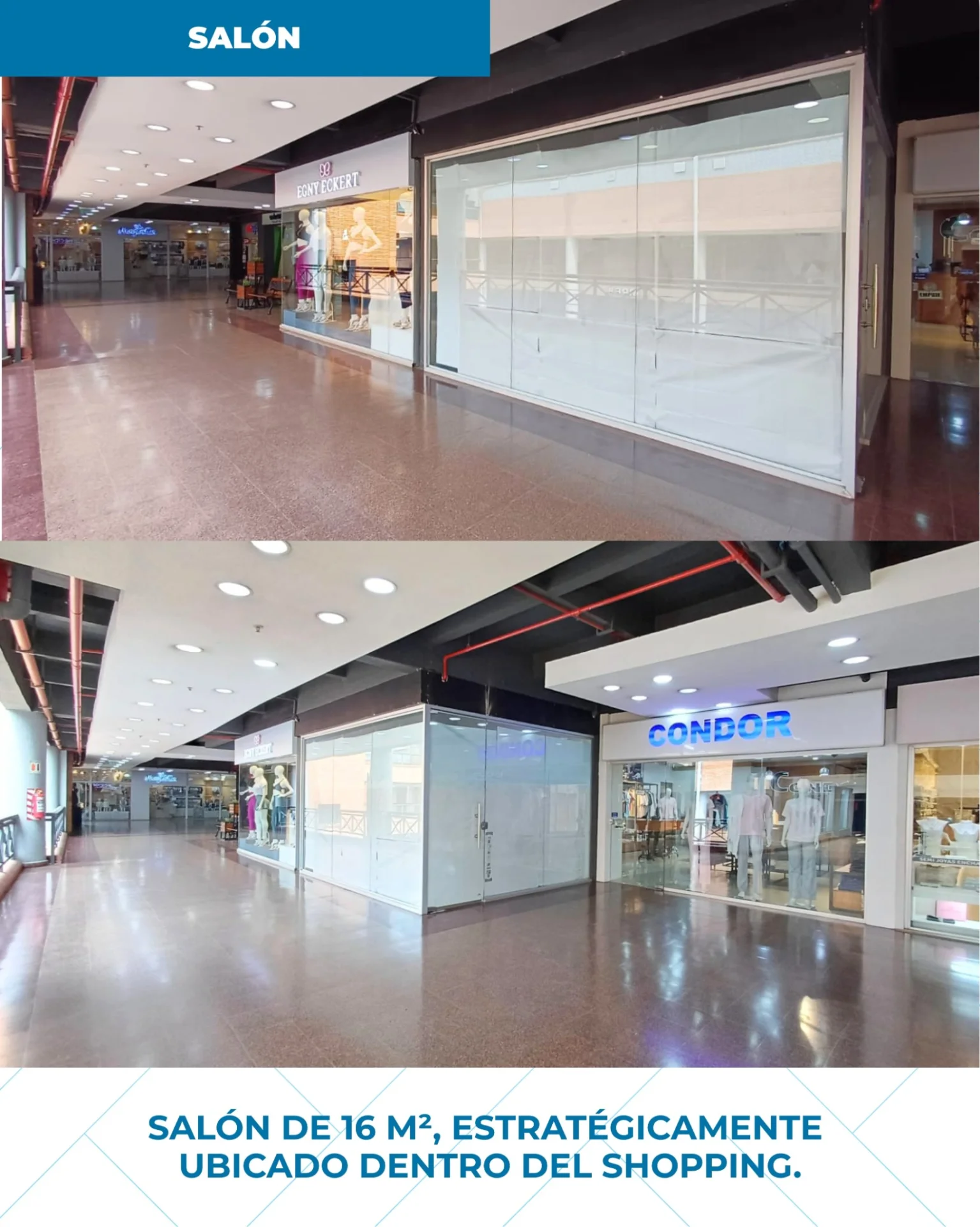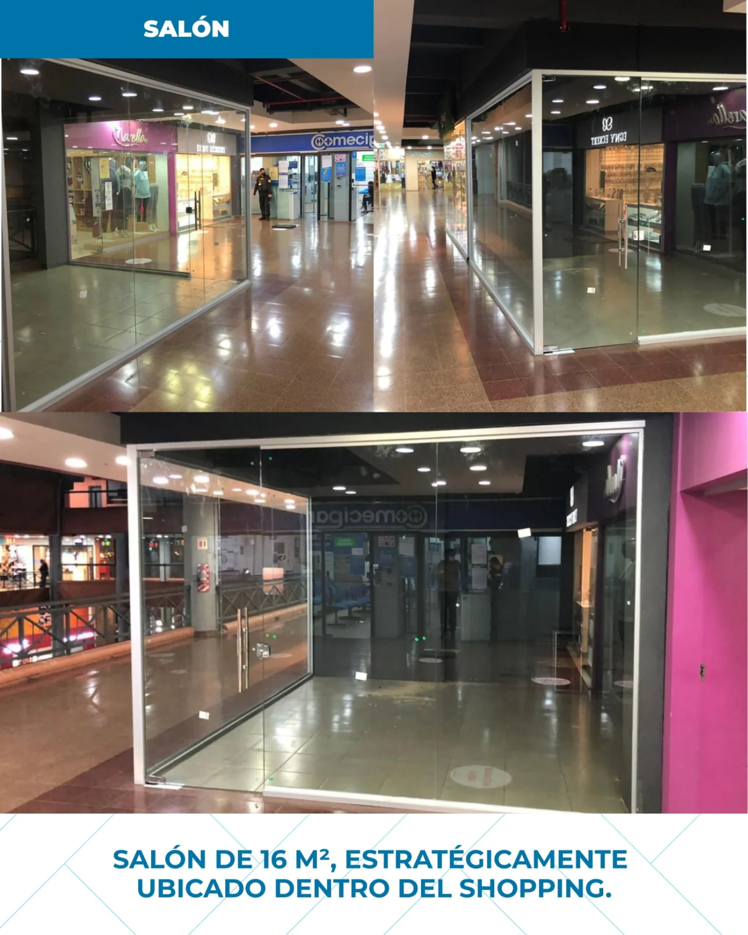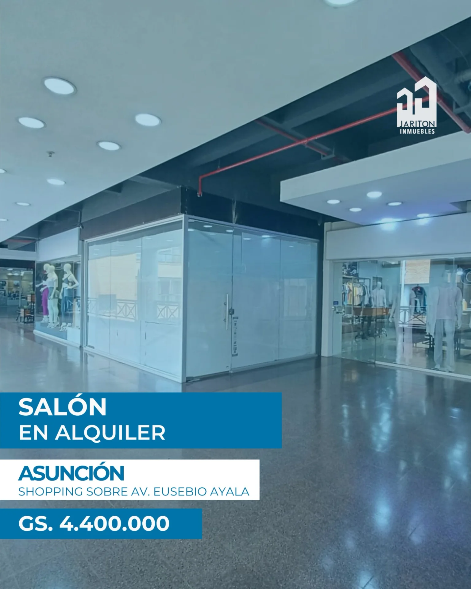 ¡Posicioná tu marca donde todos te vean! Alquilamos este salón de 16 m² ubicado estratégicamente dentro de un reconocido Shopping sobre la Avda. Eusebio Ayala. Es el espacio ideal para negocios que buscan captar el flujo masivo de una de las zonas más concurridas y dinámicas de la ciudad. Gs . ***IVA Incluido + Expensas. Avda. Eusebio Ayala, Asunción. Ventajas del local: Ubicación Premium: Localización estratégica con alta visibilidad interna. Entorno Dinámico: Flujo peatonal constante garantizado por el shopping. Comodidad: Ambiente climatizado, seguridad 24 hs y estacionamiento para tus clientes. Superficie: 16 m² optimizados para una atención eficiente. Ideal para: Islas de servicios, tiendas de accesorios, telefonía, cosmética o emprendimientos que busquen dar el salto a un entorno corporativo de alto nivel. ¡No dejes pasar esta oportunidad! Contactá con @gabyrodas_jariton para agendar una visita y conocer tu próximo punto de venta.