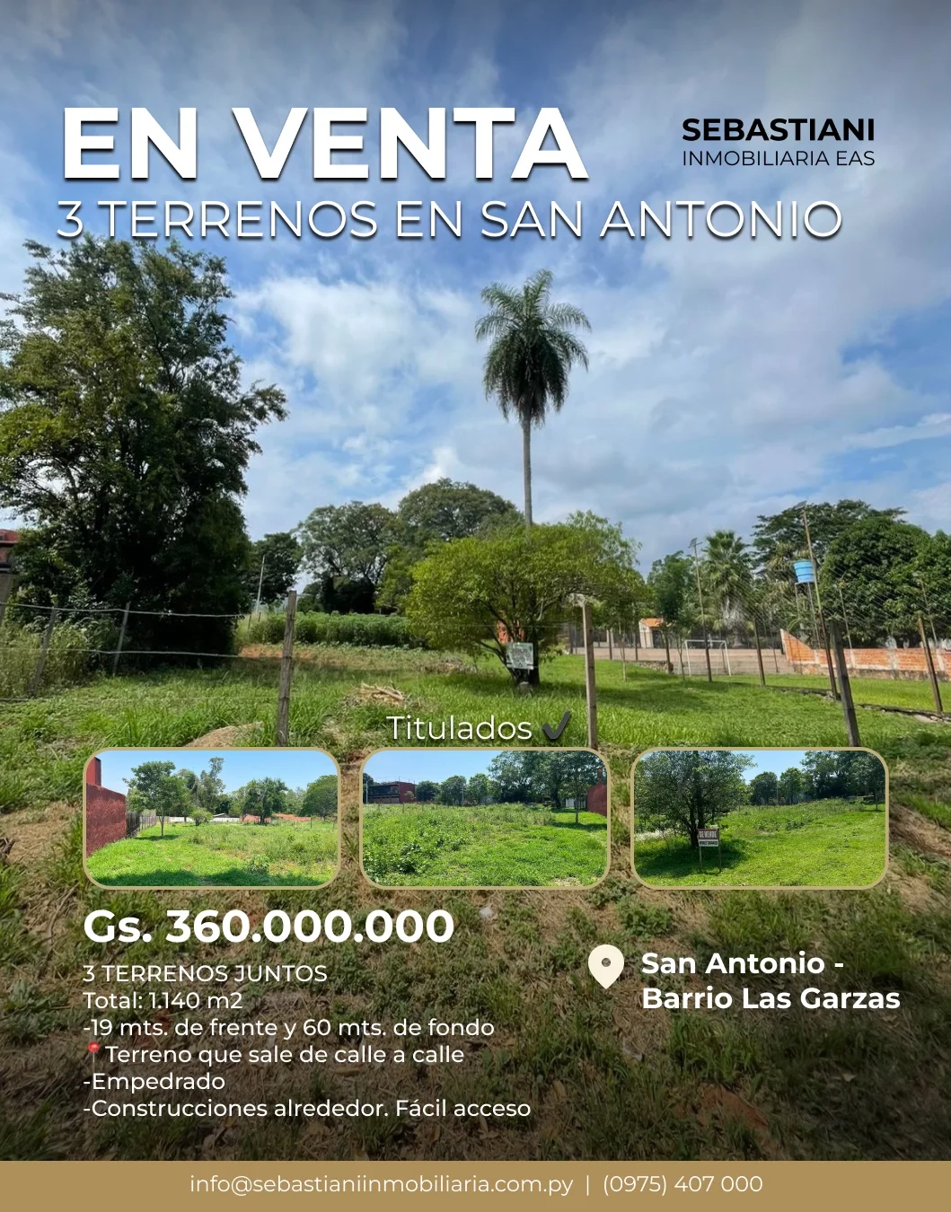 ? Oportunidad en San Antonio En venta 3 terrenos titulados juntos, ubicados en el tranquilo Barrio Las Garzas, a pocos minutos del río. Un entorno ideal para quienes buscan naturaleza, paz y espacio para construir. ✨ Perfecto para: * Casa quinta de descanso * Proyecto familiar * Inversión inmobiliaria ? Zona muy tranquila, con construcciones alrededor y fácil acceso por empedrado. ? Superficie total: 1.140 m² * 19 mts de frente * 60 mts de fondo * Terreno que sale de calle a calle ✔ Titulados ✔ Disponibilidad inmediata ✔ Precio al contado ? Gs. ***Un lugar ideal para desconectarse de la ciudad y disfrutar de la naturaleza, cerca del río y con gran potencial de valorización. ? Consultas al ***