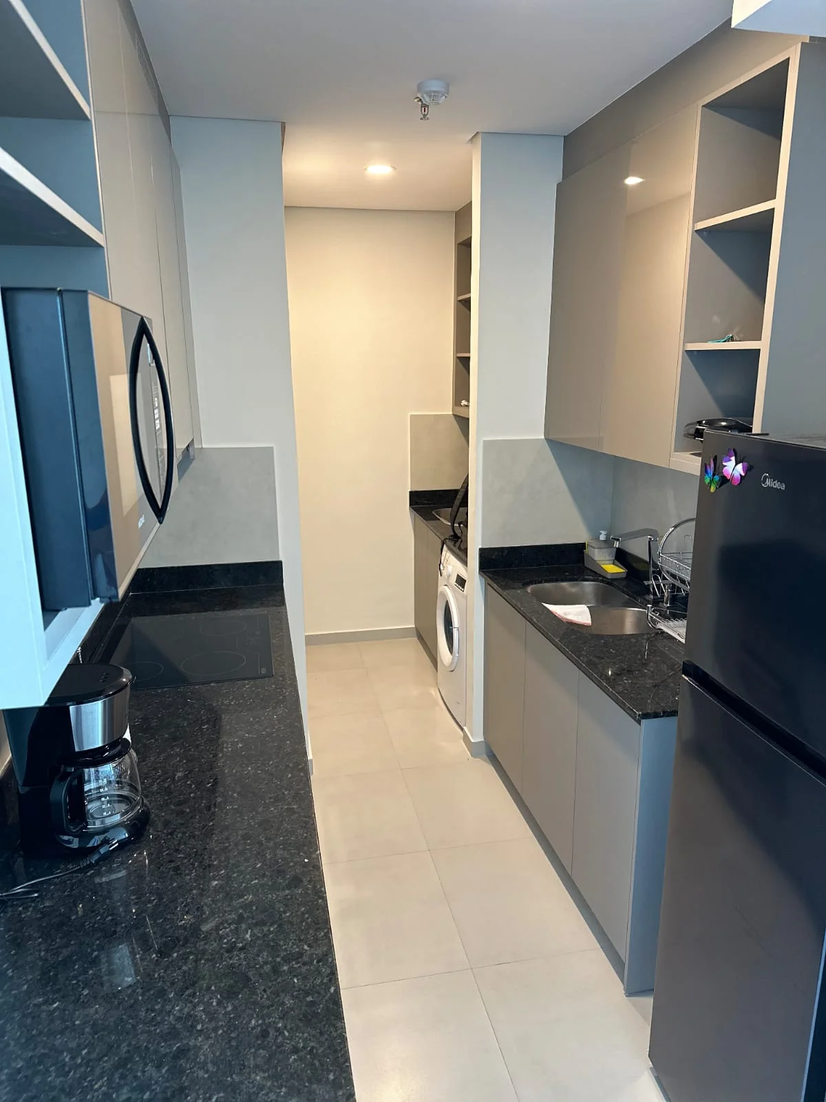 * Cocina amoblada por la Bella Cucina con mesada de granito, anafe vitrocerámica y campana extractora.
