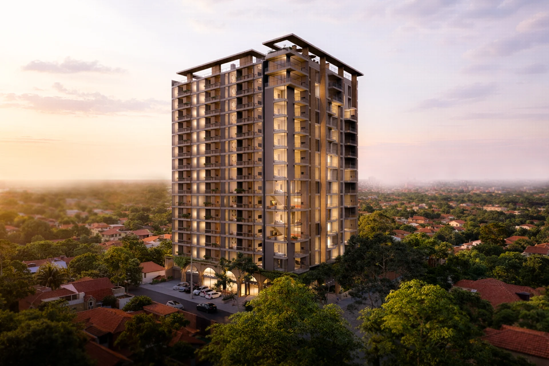 EL PROYECTO: Estructura moderna de 14 pisos residenciales, Planta Baja de doble altura y una azotea equipada con vistas privilegiadas.