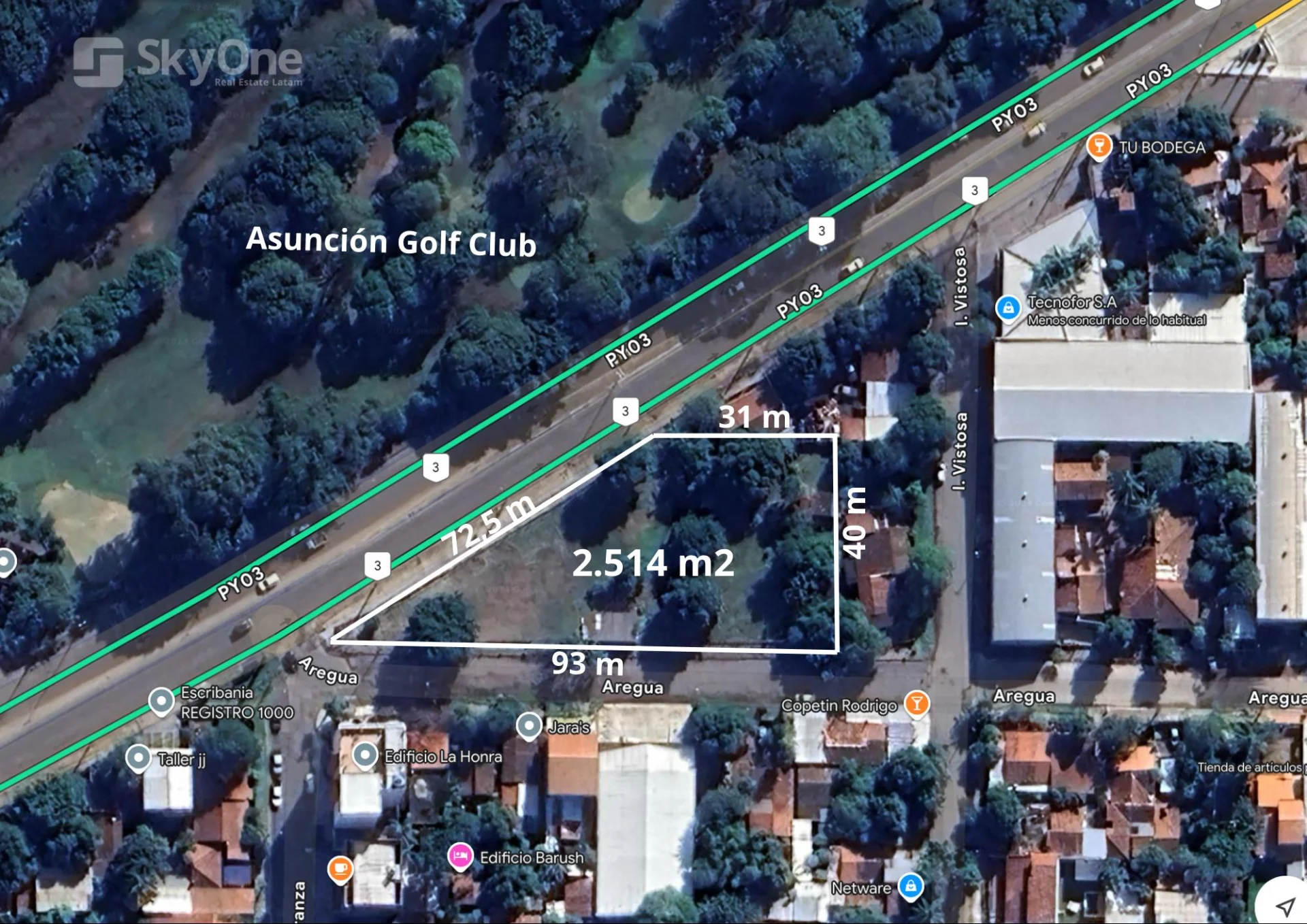 - Medidas: 72,5 m sobre la Ruta Transchaco x 93 m de fondo sobre la calle Areguá.