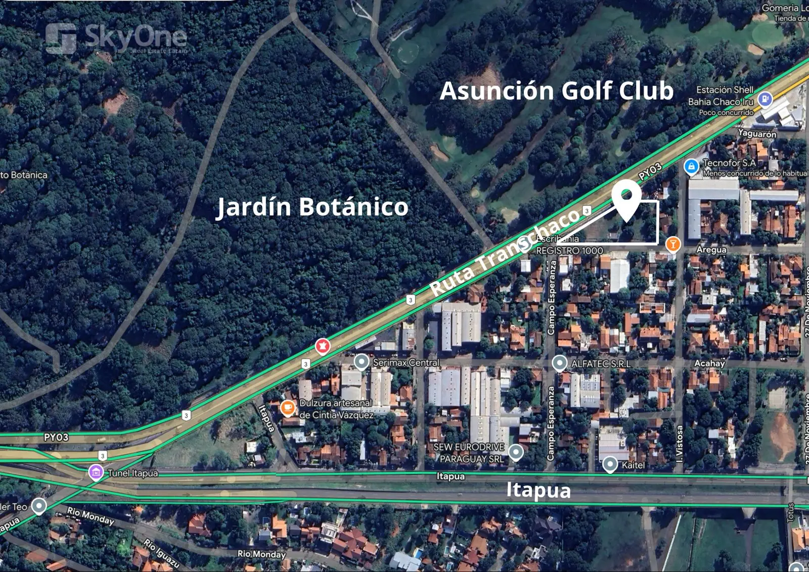 ????Barrio Mbocayaty, sobre la importante Ruta Transchaco esquina Areguá. Frente mismo al Asunción Golf Club y Jardín Botánico. A solo 5 minutos del nuevo puente Héroes del Chaco y a solo 7 minutos del aeropuerto internacional.