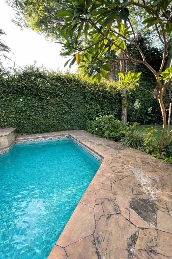 Jardín empastado con piscina