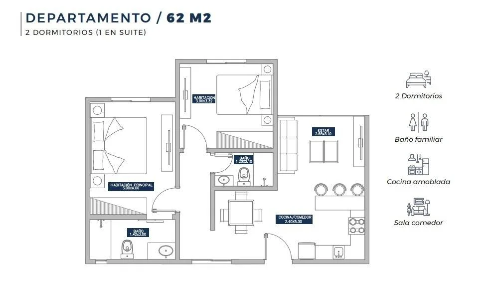 - 62,75 M2 propios con balcón.