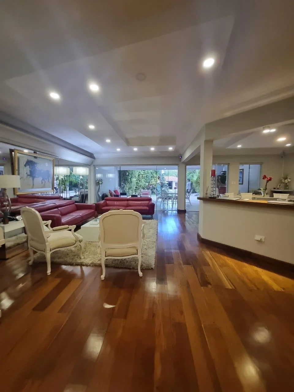En Planta baja:▪️Amplio estar familiar integrado al comedor.▪️Una Oficina o Sala TV Cocina amoblada y equipada▪️Baño social.▪️Quincho climatizado.Habitación de servicio + área de lavadero▪️Cochera para más de 4 vehículos.▪️Jardin con Piscina y Jacuzzi.2 habitaciones de Huéspedes con baño familiar compartido.▪️Generador propio.