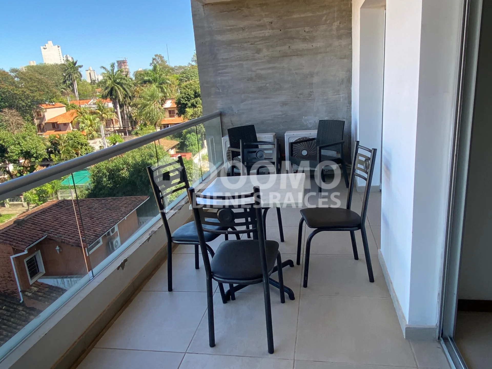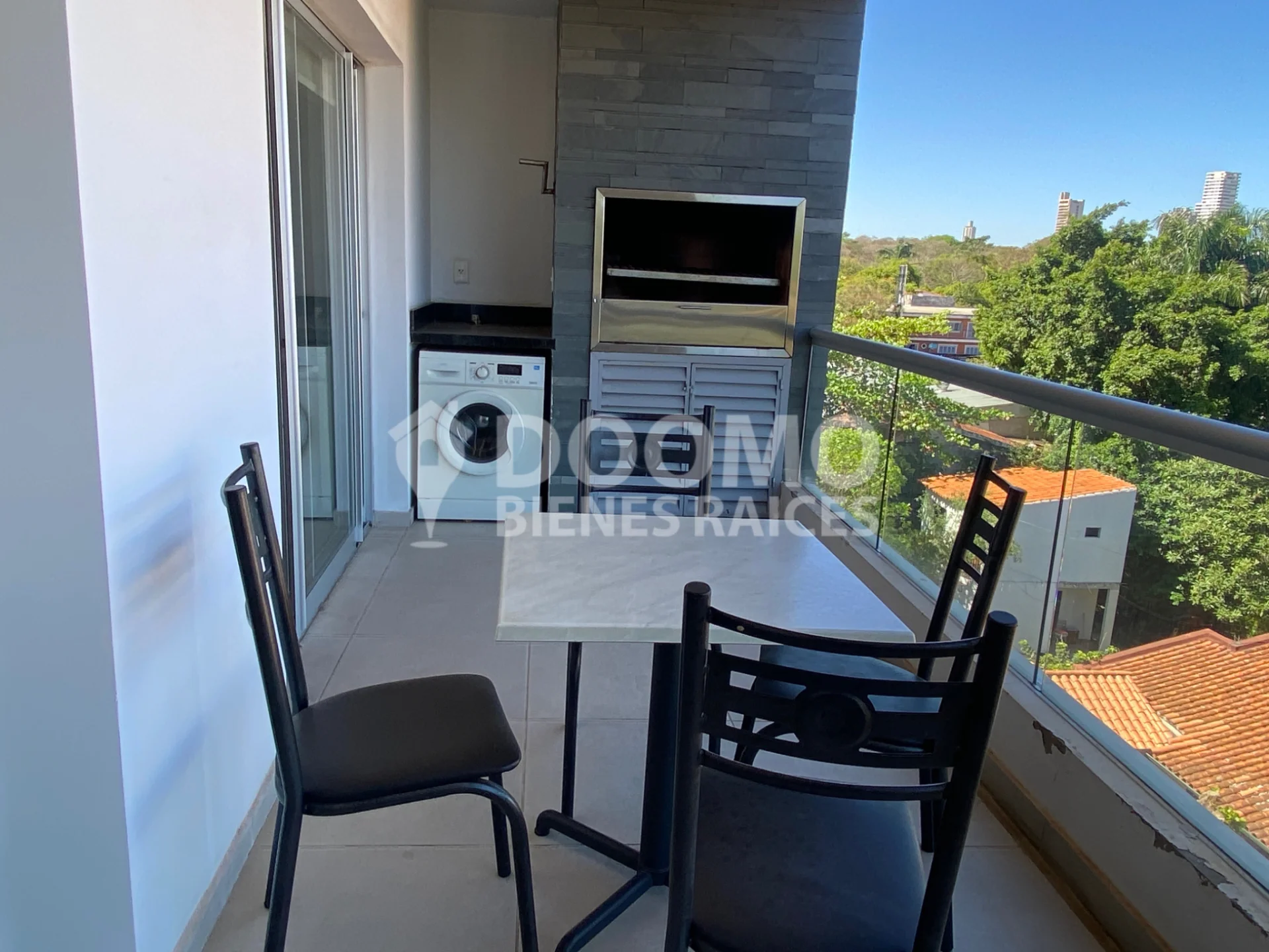 Amplio balcón con parrilla y vista espectacular hacia el eje corporativo.