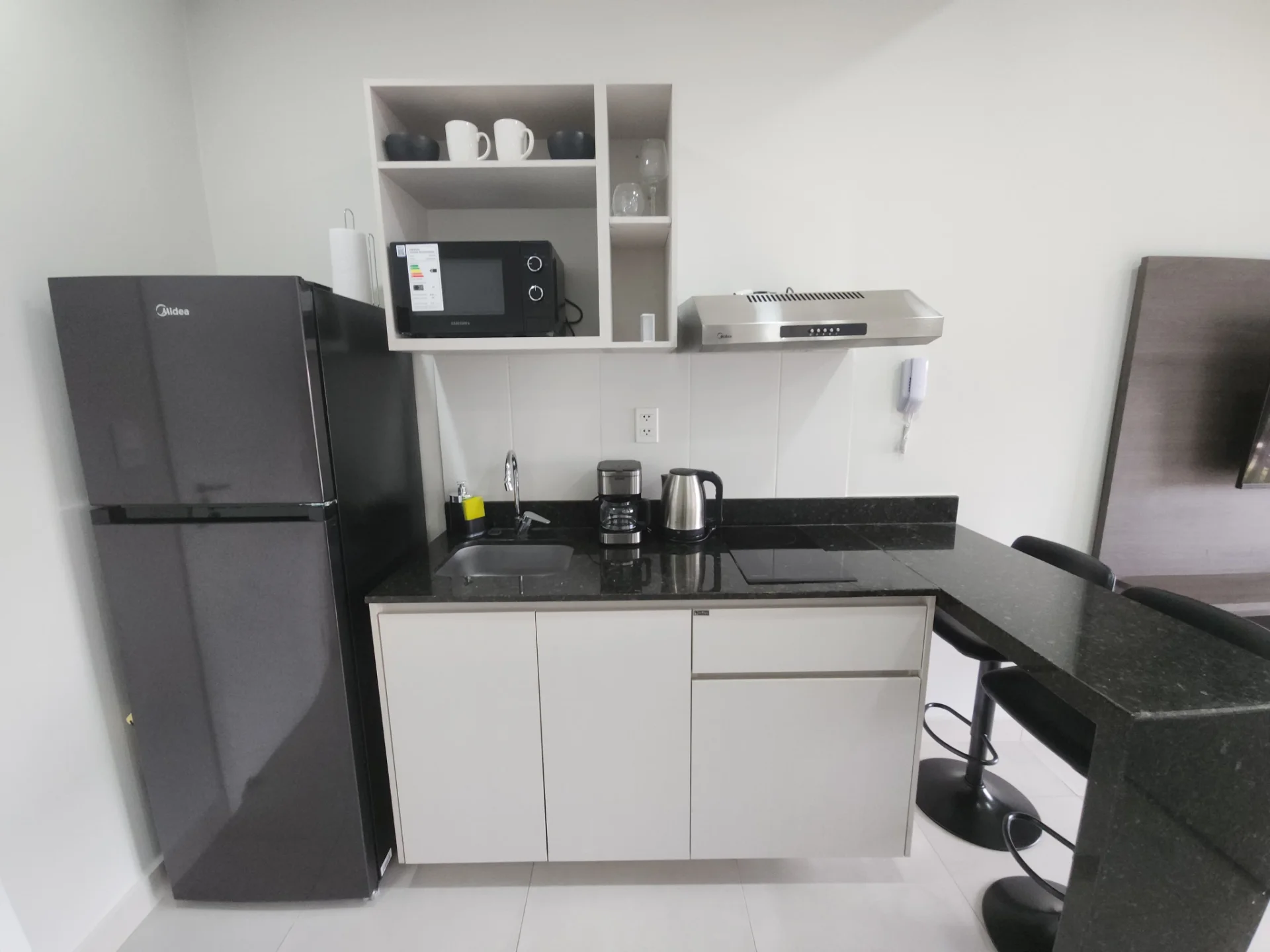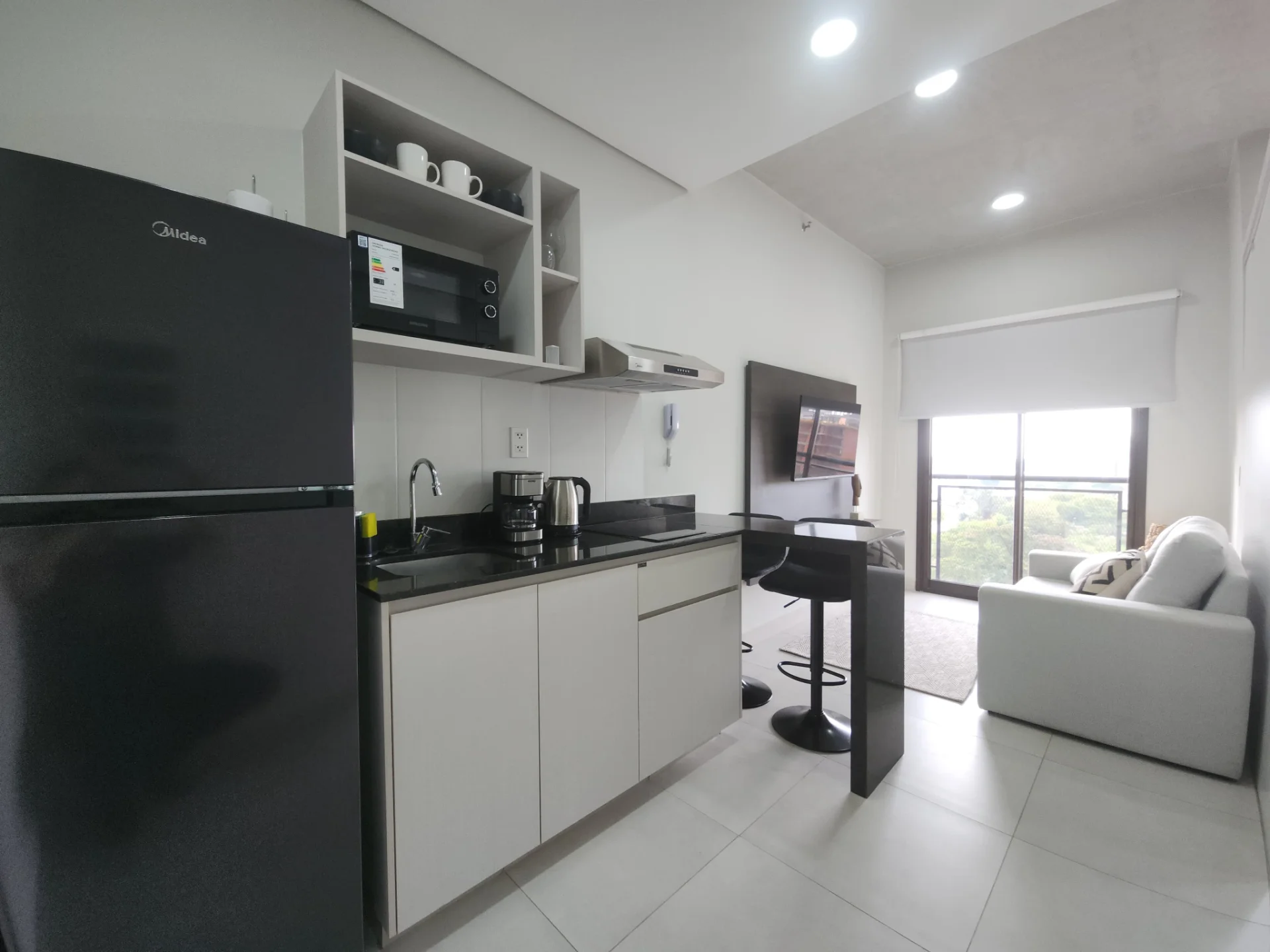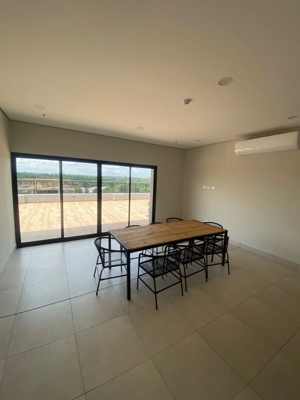 - Sala y comedor integrada a la cocina equipada con anafe y purificador.