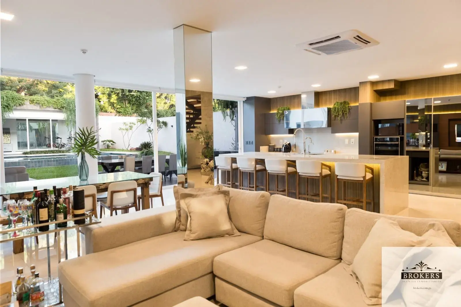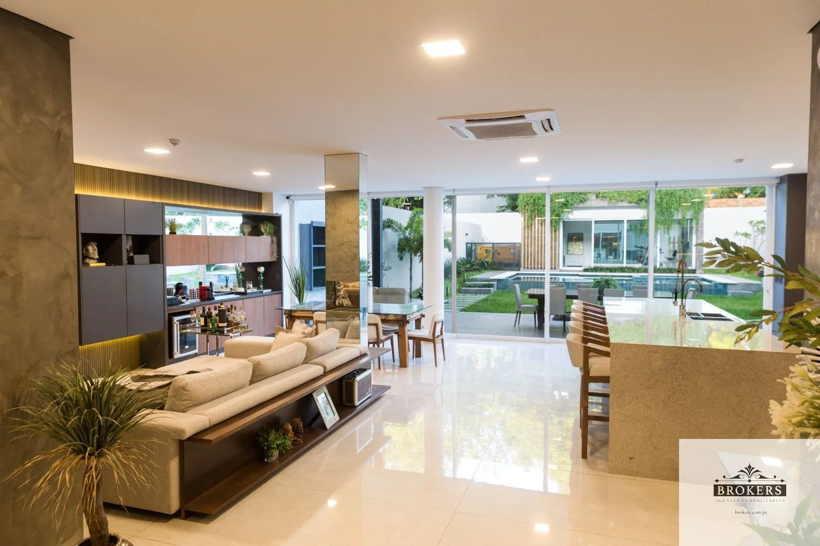 Planta Baja: Living comedor con cocina social integrada, galería con parrilla. Patio y piscina. Salón multiuso (gym, sala de estudios, pilates, etc) con baño.