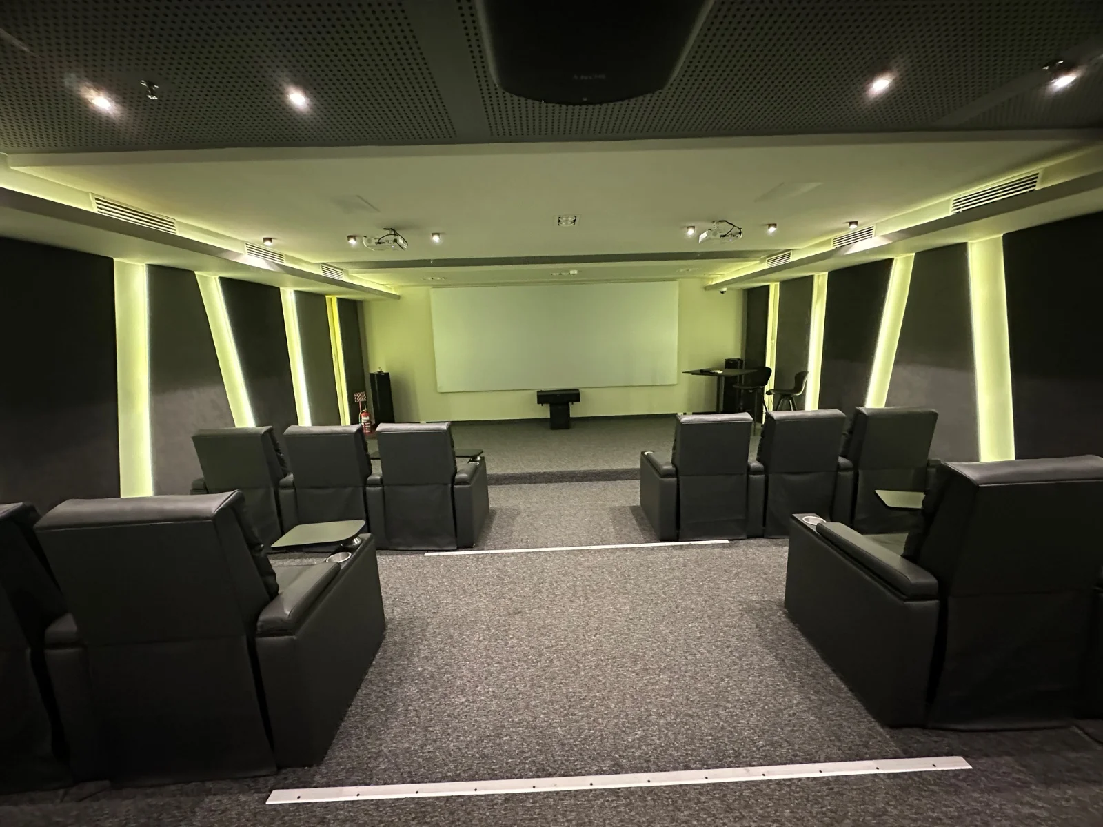 Salón auditorio equipado con sofás, proyector, pantalla y sistema de audio.
