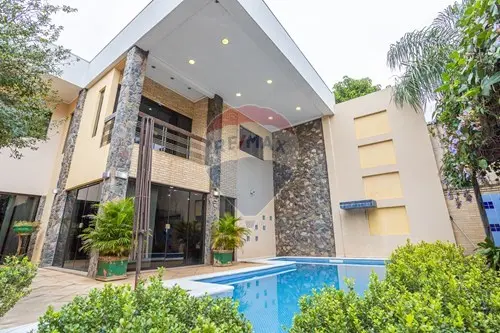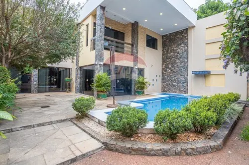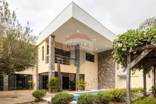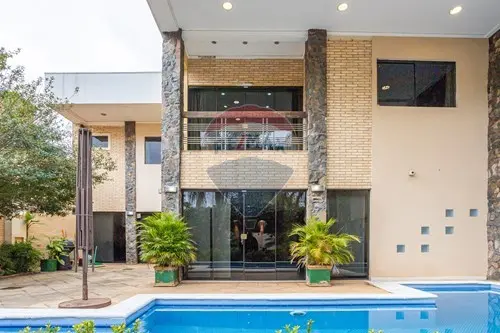 La casa tiene un espacio para varios vehículos, el amplio patio construido al frente de la propiedad con una amplia piscina.