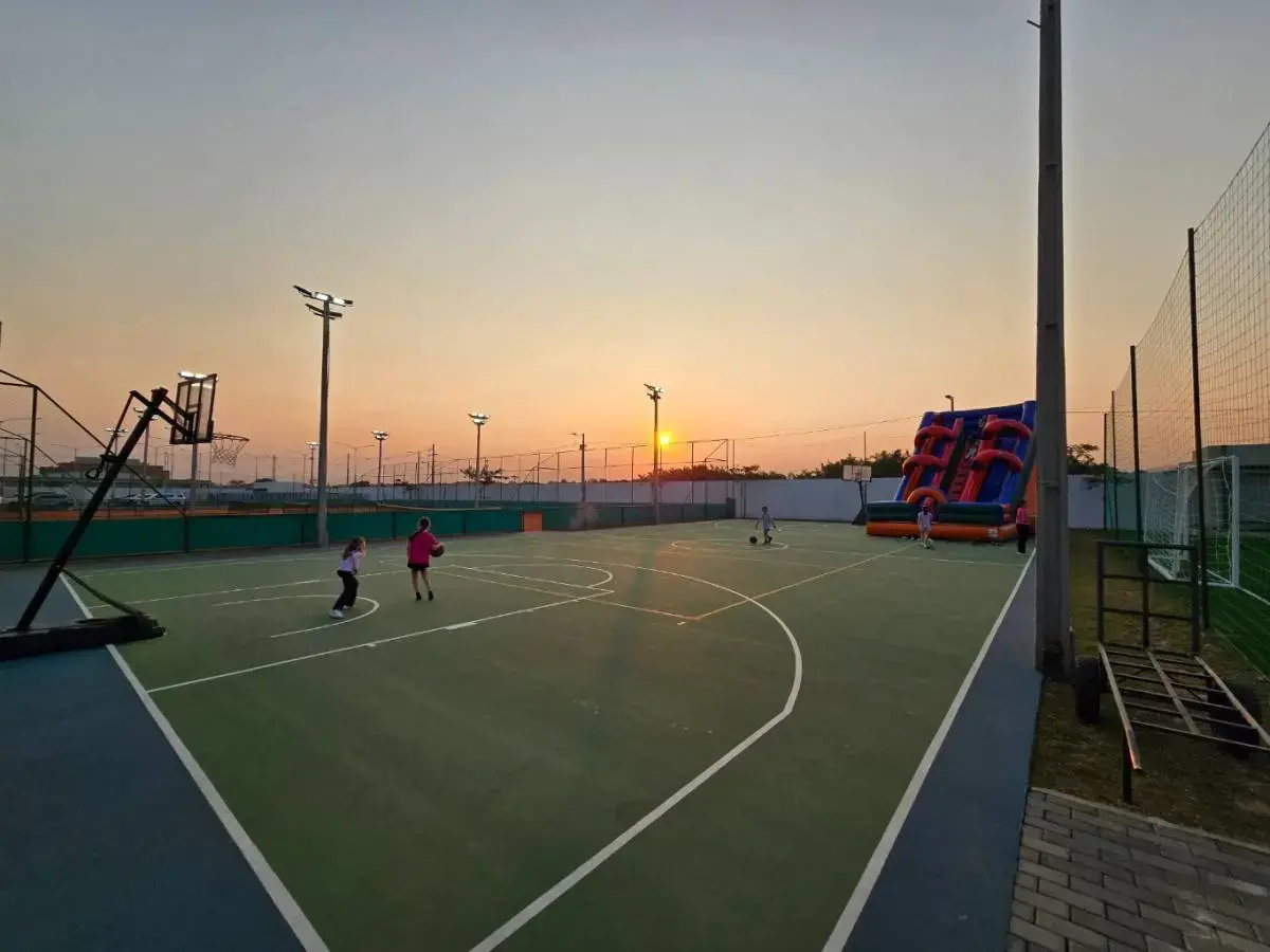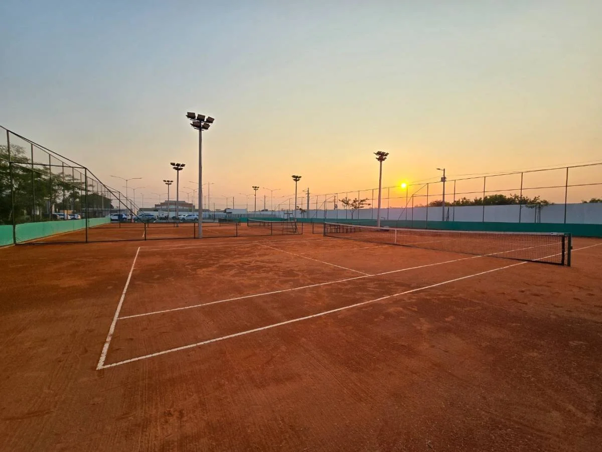 Área deportiva con canchas de tenis, futbol, padel, basquet y volley.