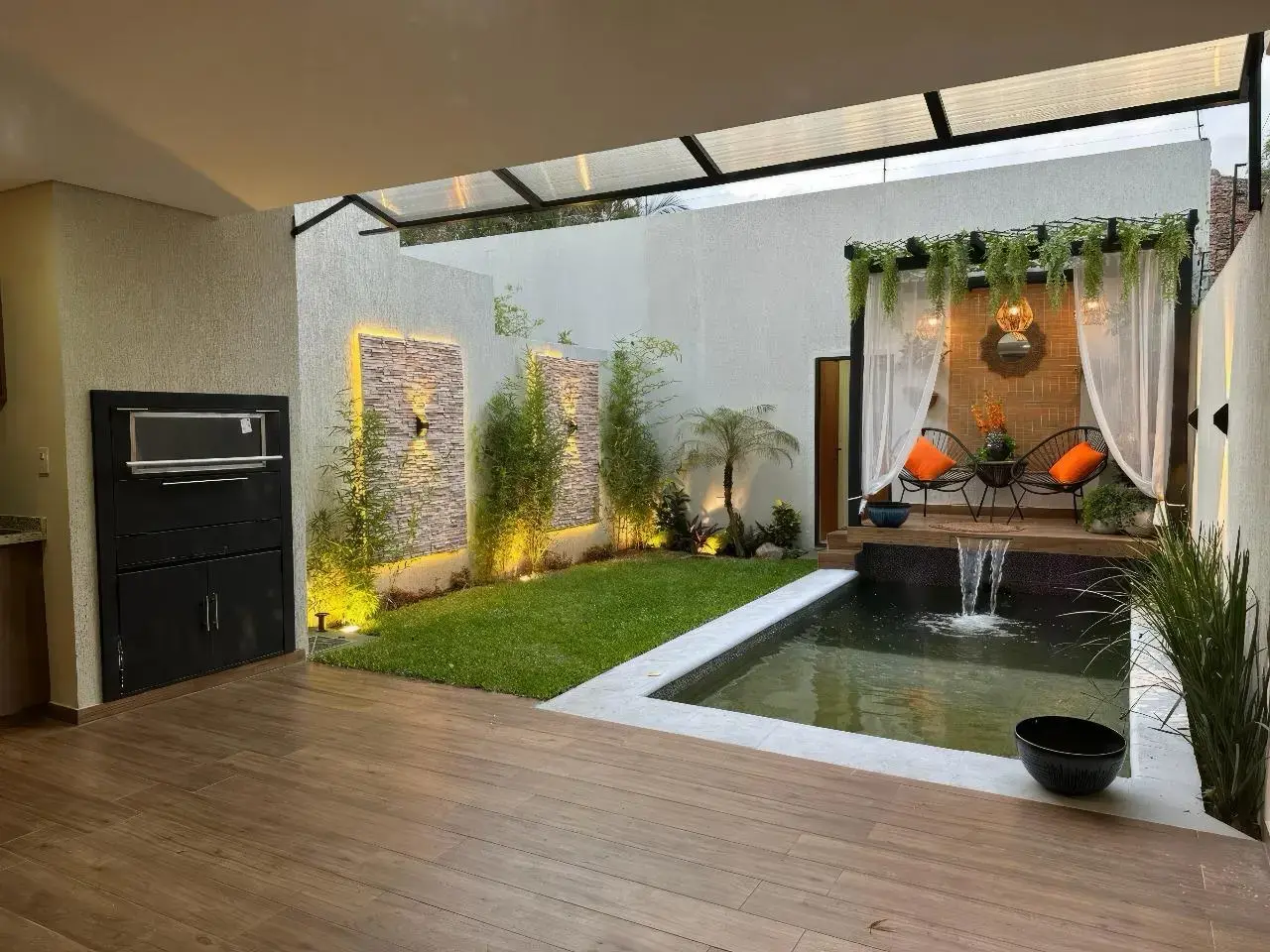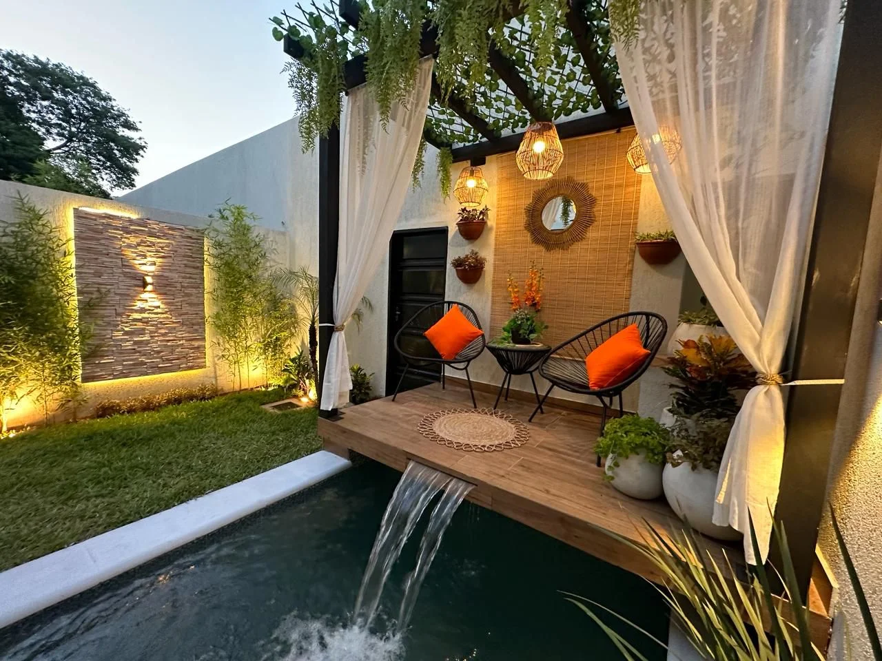 * Quincho con parrilla y piscina con deck y cascada