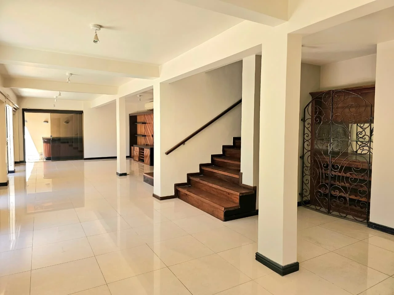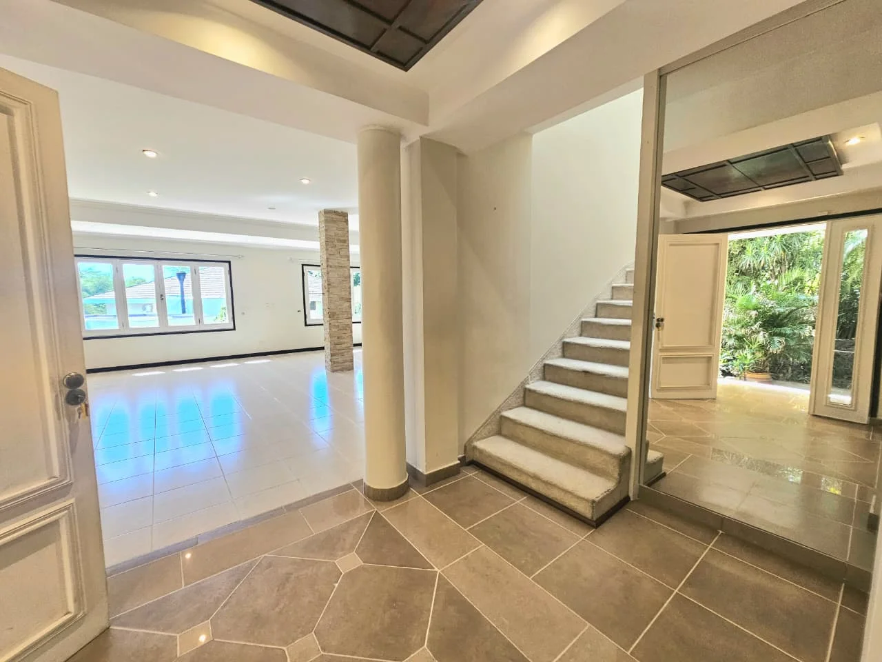* Escaleras alfombradas de color manteca que conectan a la planta alta también alfombrada.