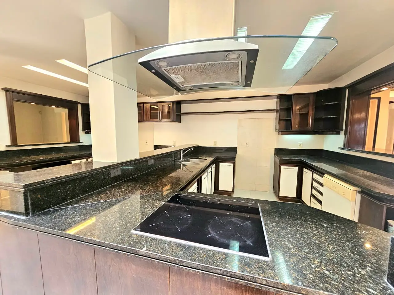 * 2 área de cocina, con amplios espacios, muebles de pared a pared y mesadas de mármol negro, anafe y purificador