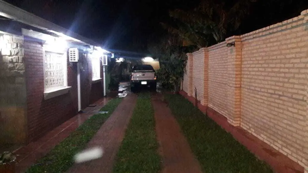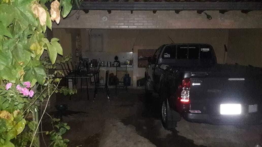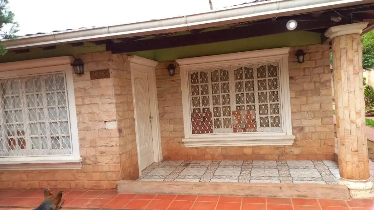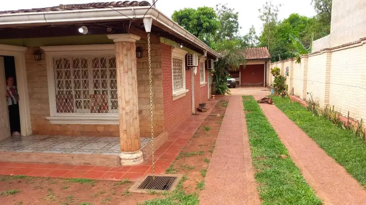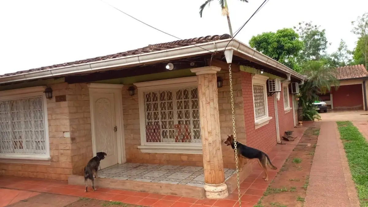 Fachada y Acceso: Entrada principal con revestimiento de piedra, rejas de seguridad en todas las aberturas y un amplio acceso vehicular con sendero de césped que conduce a una cochera techada con capacidad para varios vehículos.