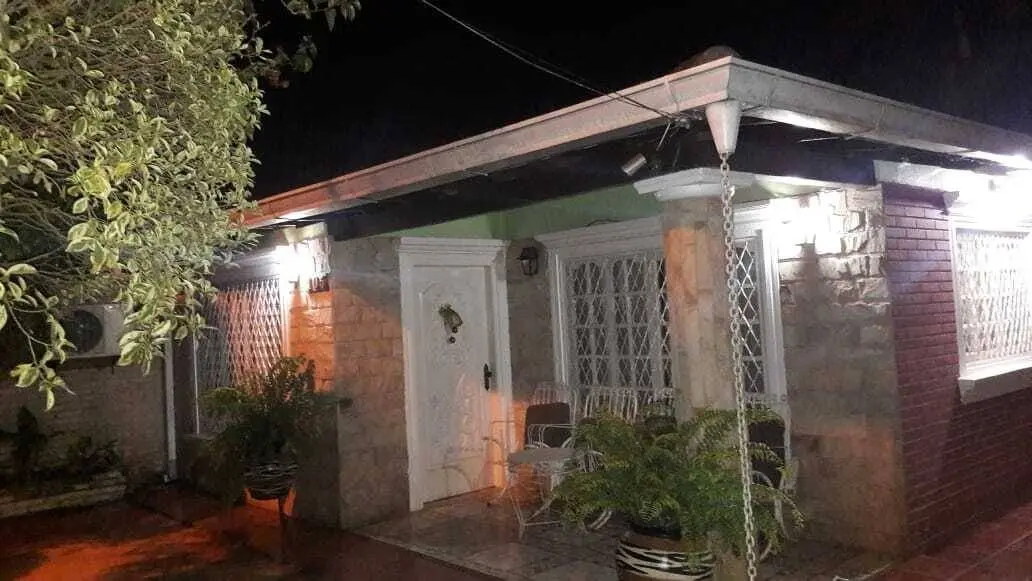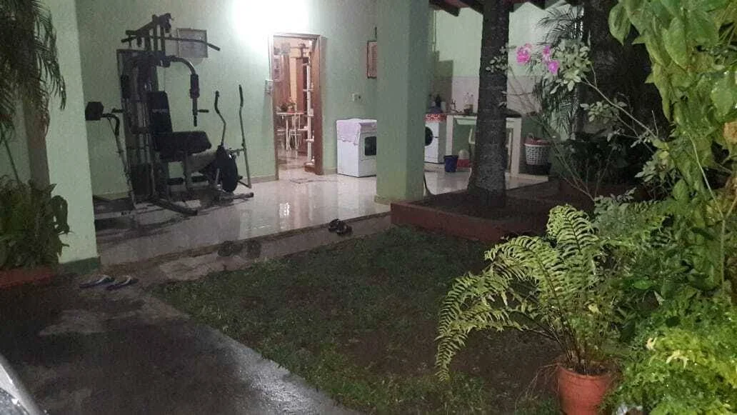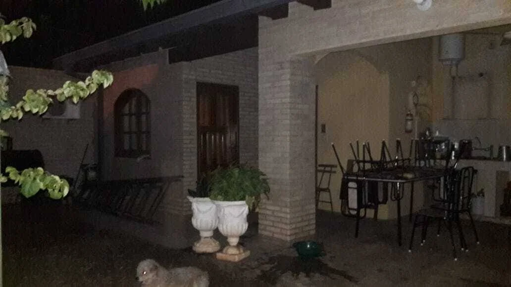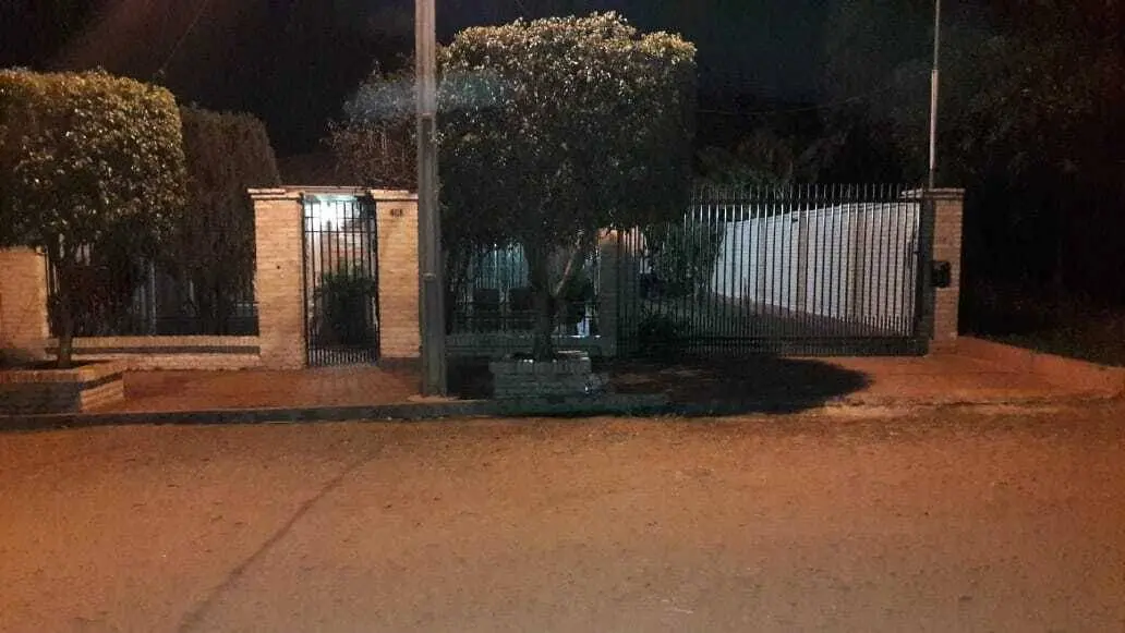 Fachada y Acceso: Entrada principal con revestimiento de piedra, rejas de seguridad en todas las aberturas y un amplio acceso vehicular con sendero de césped que conduce a una cochera techada con capacidad para varios vehículos.