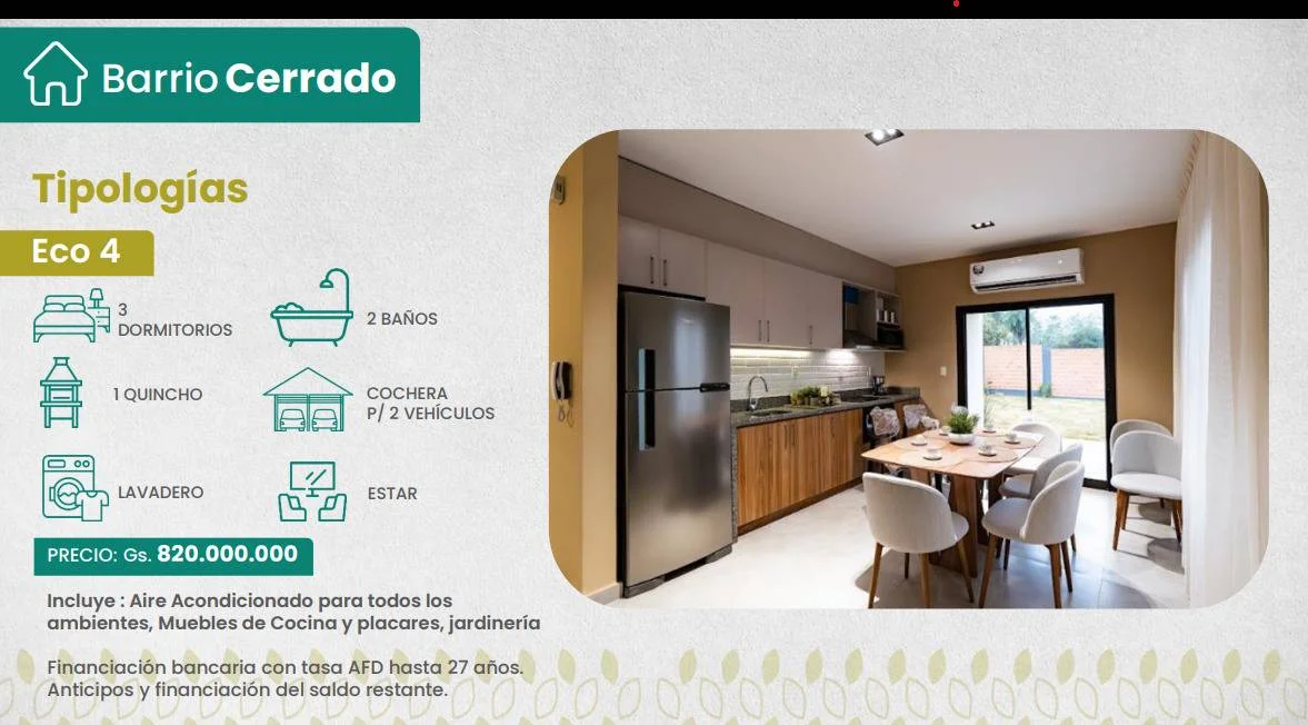 Opción 1: Totalmente equipada. Incluyen jardinería, muebles de cocina, placares y acondicionadores de aire.