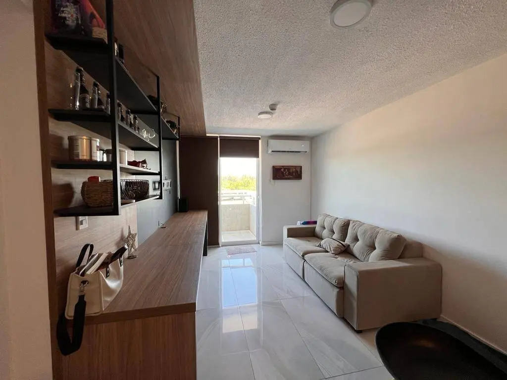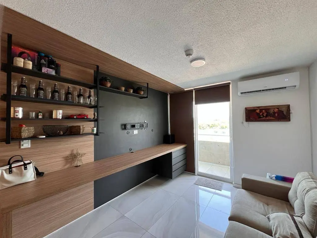 Sala, comedor y cocina integrada con vista a los amenities