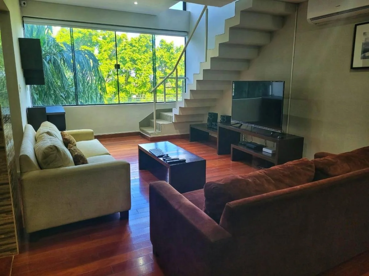 En venta departamento tipo duplex de 1 dorm. en Edificio Macondo zona Yacht Cuenta con: - 1 habitación en suite - Área sala cocina comedor - Jacuzzi con vista al río - 1 estacionamiento Incluye: aire acondicionados, mueble de cocina, un sofá, una mesa comedor con 4 sillas, una cama matrimonial, un TV de 32 pulgadas y placard Área común: - Piscina - Quincho al aire libre Precio: ***gs Listo para transferir Agenda tu visita