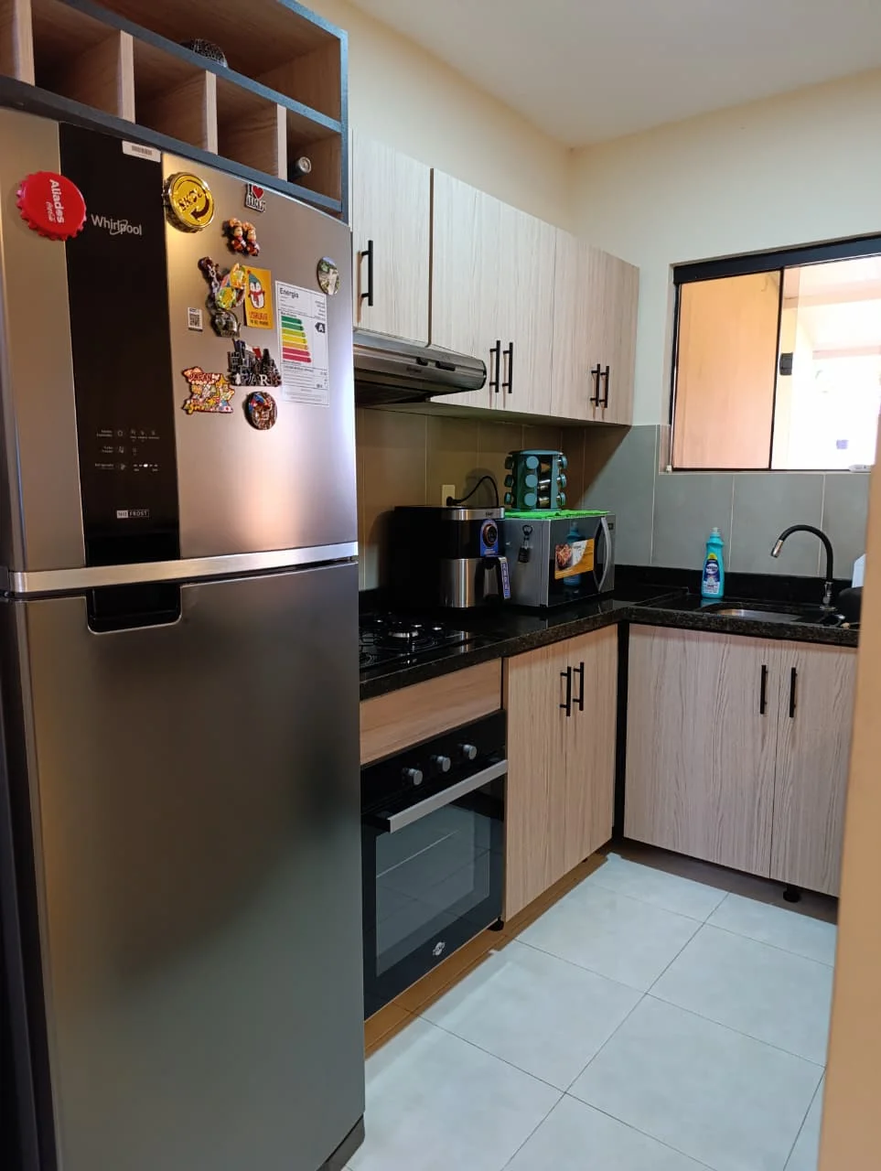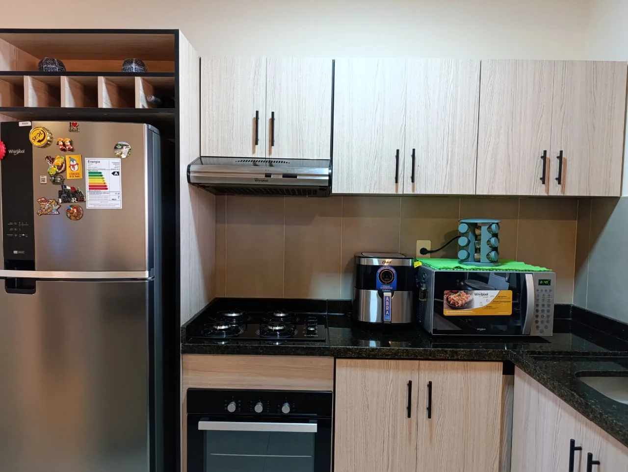 Cocina amoblada de granito, equipada con anafe, extractor y horno empotrados
