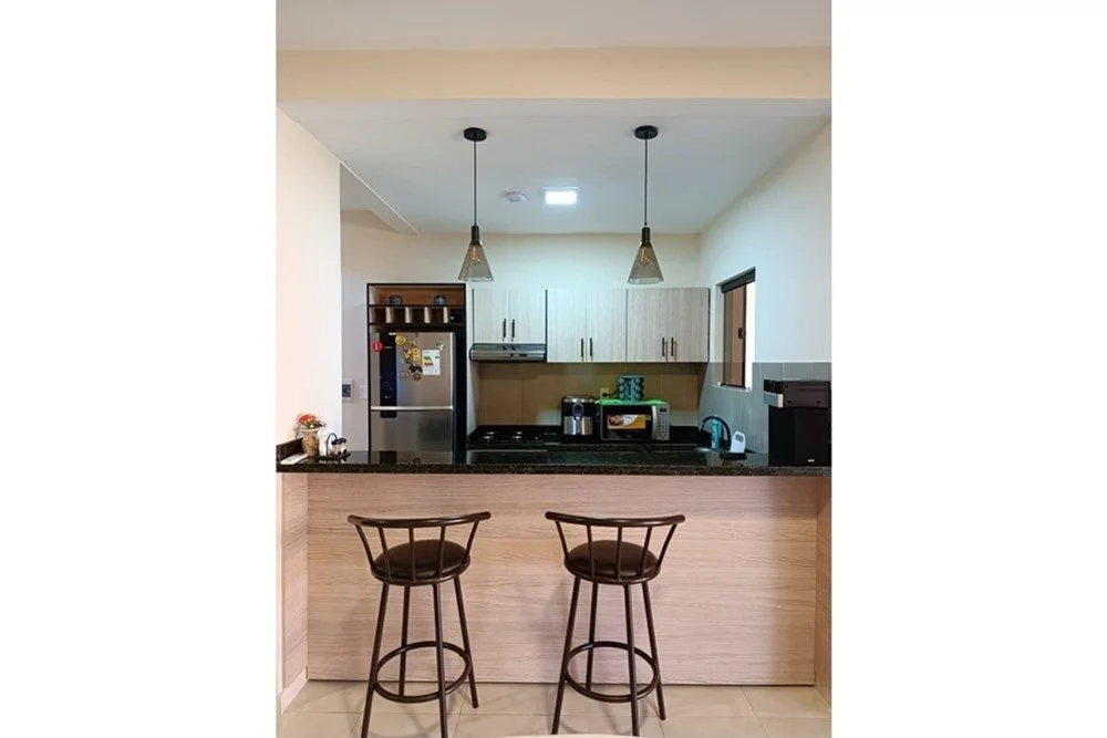 Amplia sala de estar y comedor integradosCocina amoblada de granito, equipada con anafe, extractor y horno empotradosBaño SocialAmplio patio con quincho integradoCochera para dos vehículos
