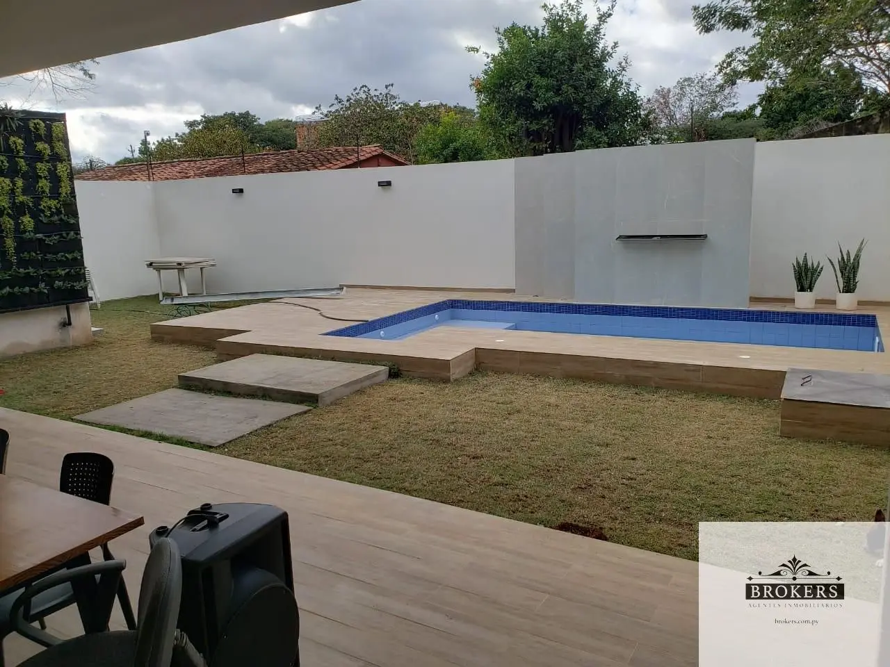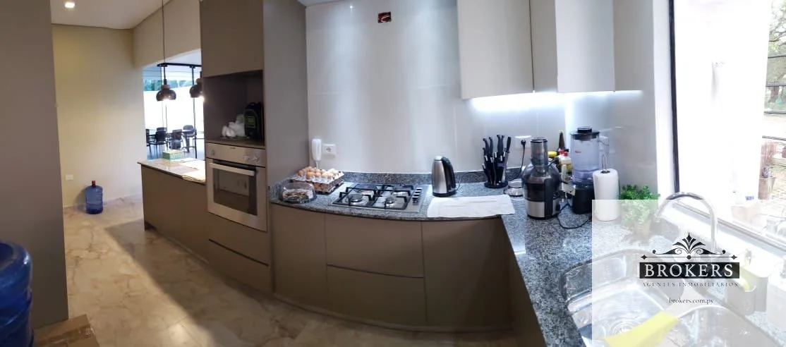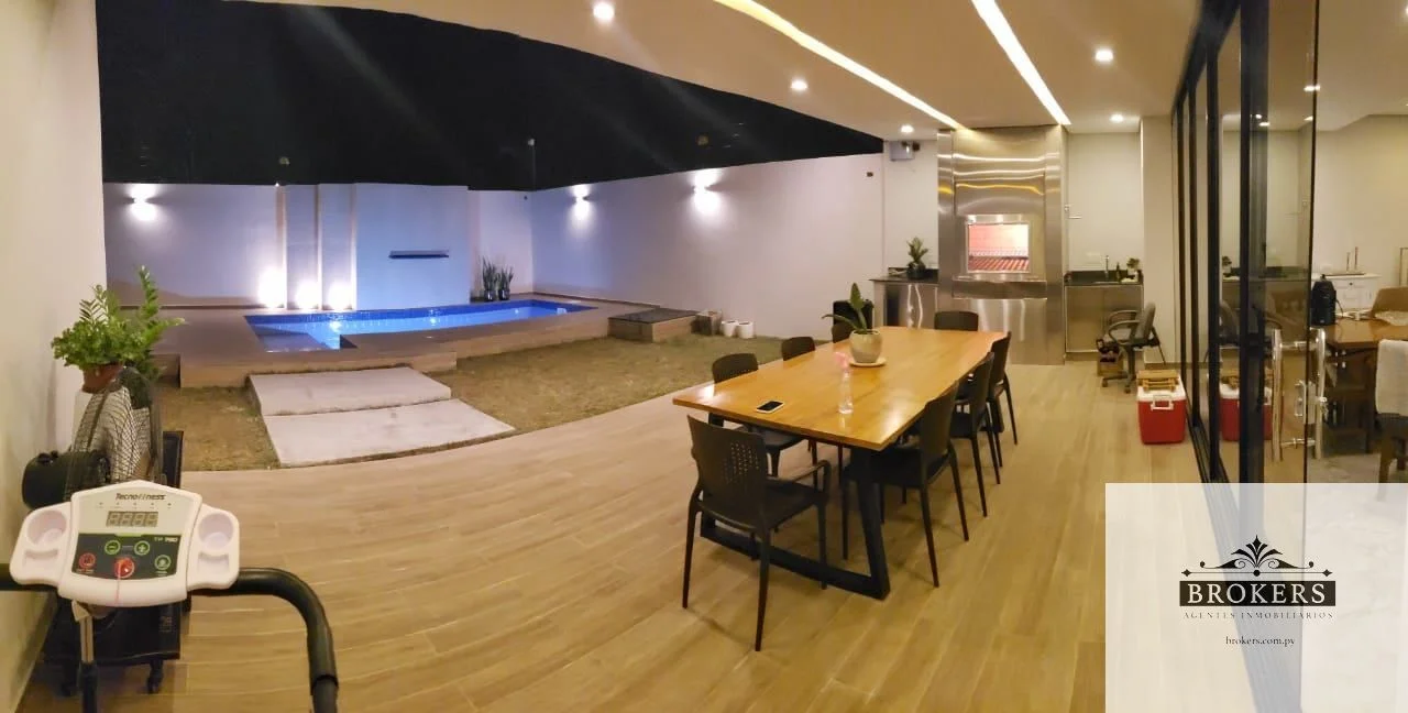 La planta baja cuenta con capacidad para cinco vehículos en la cochera, la casa ofrece un living comedor amplio y dos depósitos internos. La cocina, equipada con muebles de alta calidad ACHON, se complementa con un lavadero amoblado y un tendedero. También se incluye un dormitorio espacioso para personas mayores con baño en suite y un baño social para visitas. El quincho y la parrilla son amplios, con mesadas y bacha, perfectos para disfrutar de asados en familia. Para completar este oasis, la propiedad cuenta con una piscina que invita a relajarse y disfrutar del clima.