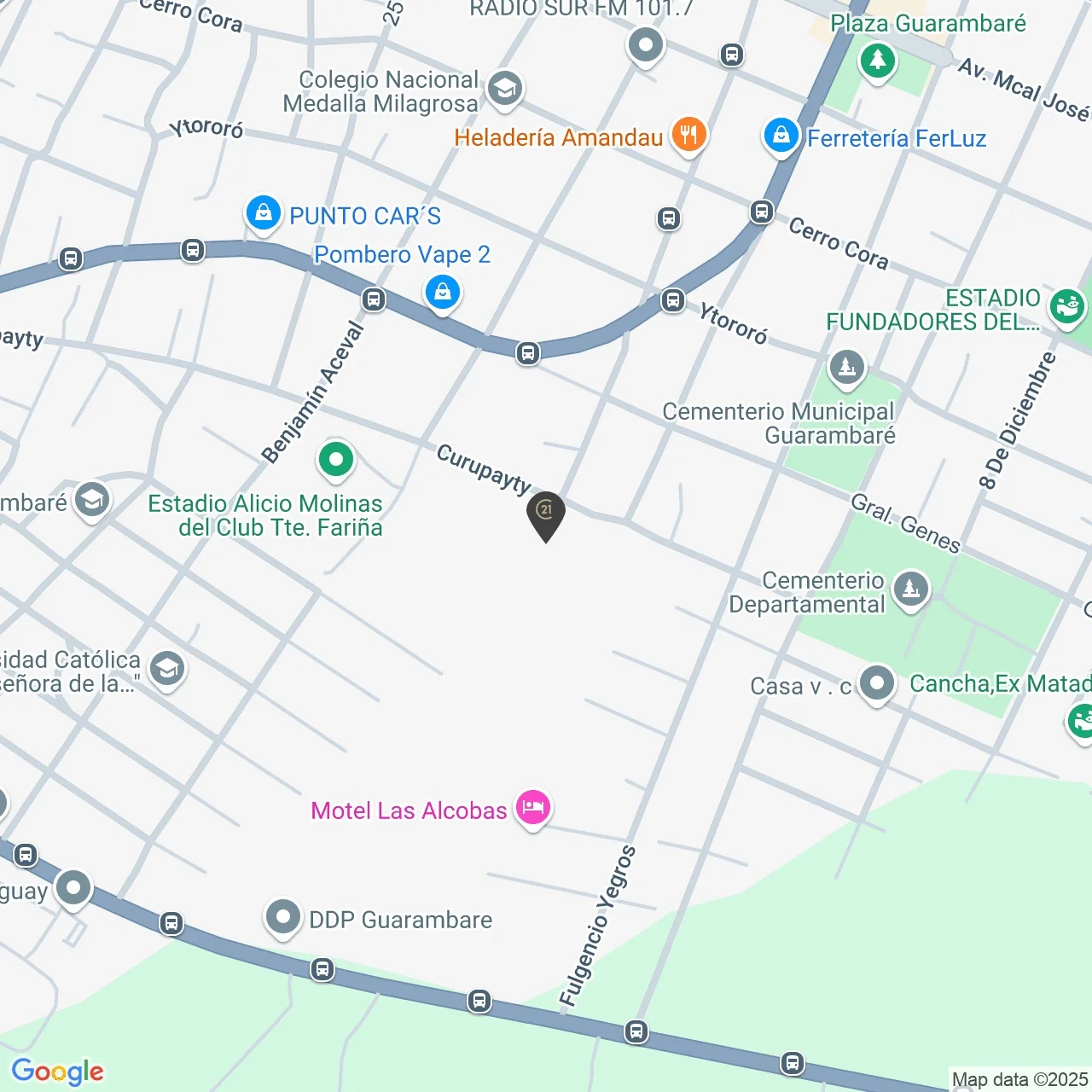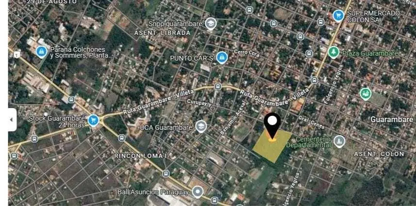 A 2 min de la UNIVERSIDAD CATOLICA DE GUARAMBARE, a 250 m del Centro de Salud de Guarambaré, a 300 m de la RUTA GUARAMBARE VILLETA, y 3 min de la Municipalidad de Guarambaré, sobre la calle Curupayty, rodeada de escuelas, iglesias y comercios. Ideal para desarrollos inmobiliarios.