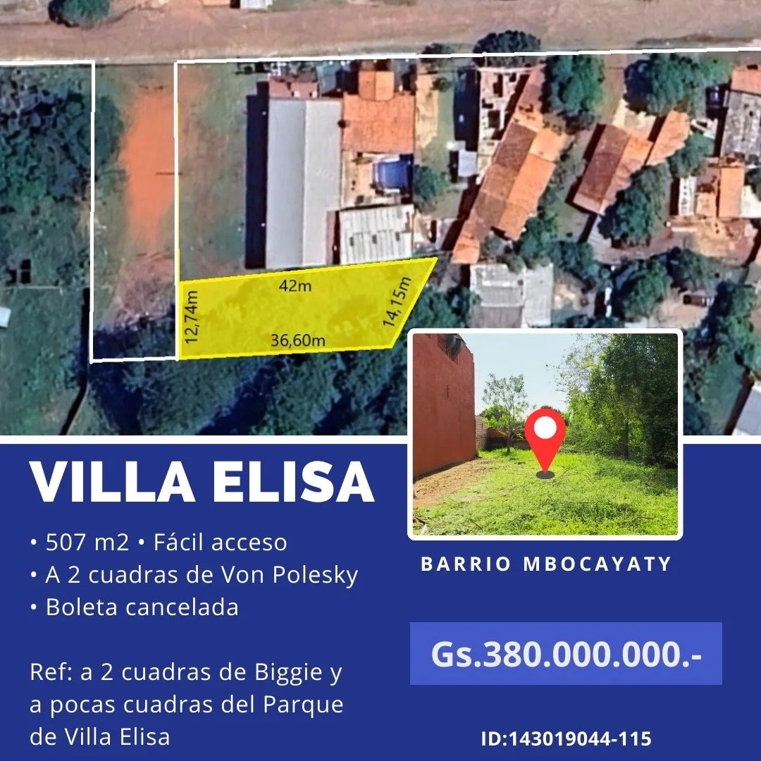 ????Terreno de 507m2 a tan solo 2 cuadras de la Avda Von Polesky, en el Barrio Mbocayaty de Villa Elisa. Zona totalmente Residencial. ????Dimensiones: Frente: 12,74; Contrafrente: 14,75; Fondo: 36,50; 42,09. Total:507m2.