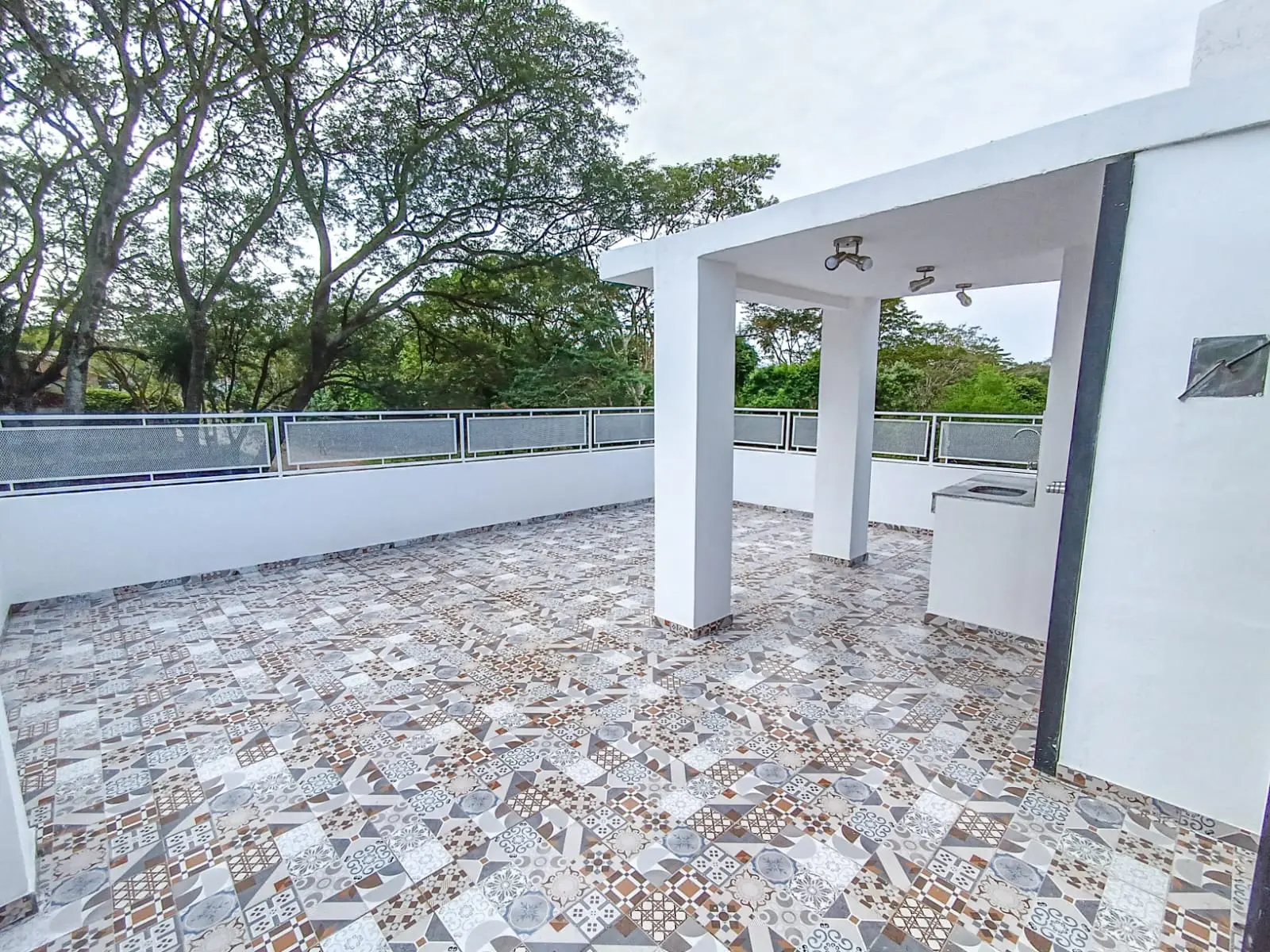 Quincho techado con parrilla rotativa y un baño. Todo el tercer piso con baranda.