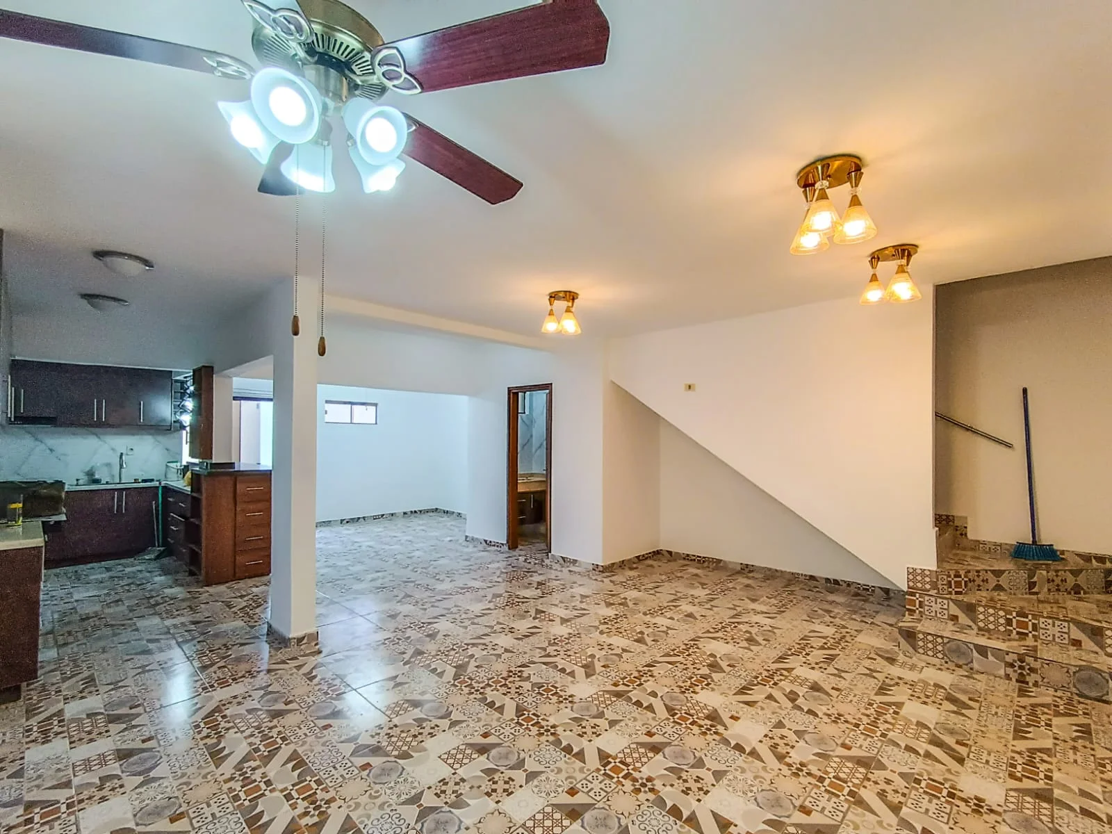 Sala amplia con ventiladores y aire acondicionado.